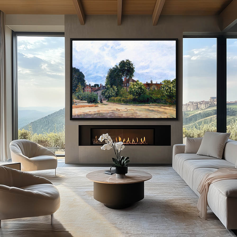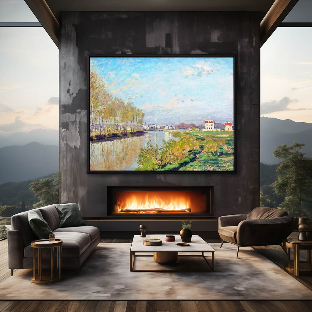 Vintage River Landscape Painting with Flowers in Bloom near the River