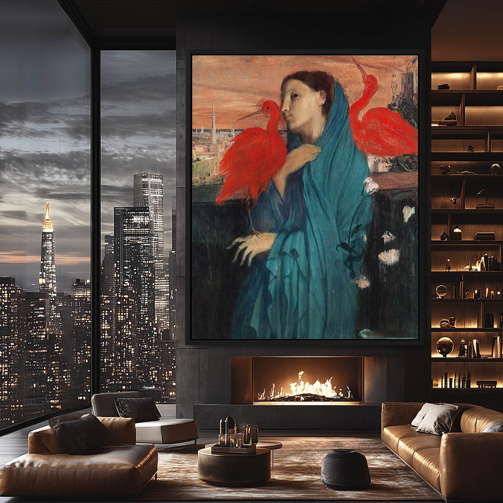 Woman in blue cape with red ibis