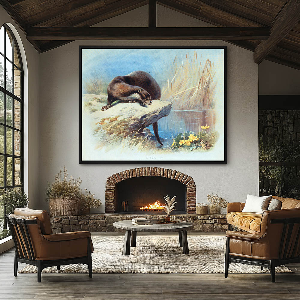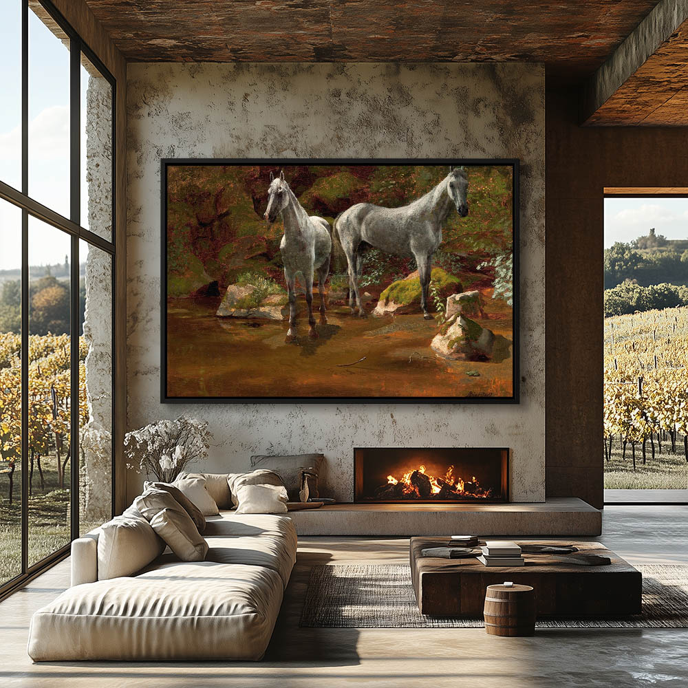 Fairies and other winged creatures lounging and playing musical insturments in a tree overhanging a pond with a rider on the bank and the silhouette of a caste in the distance