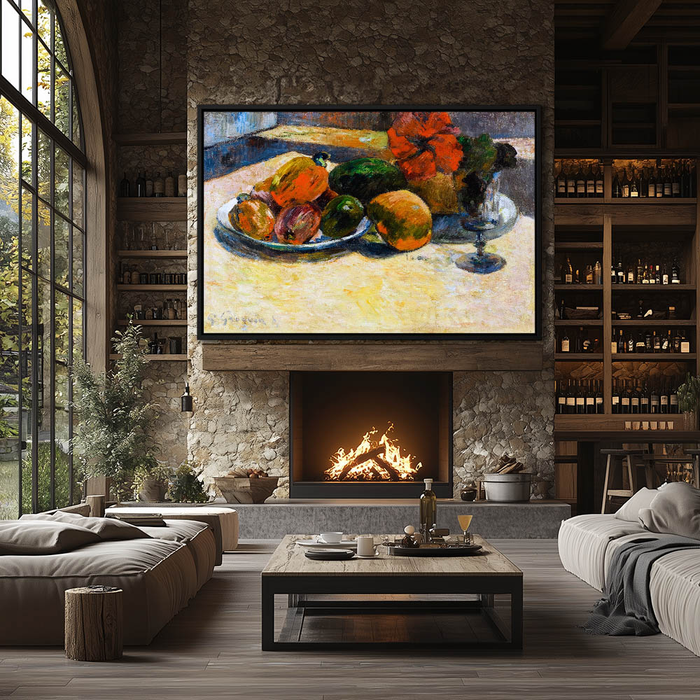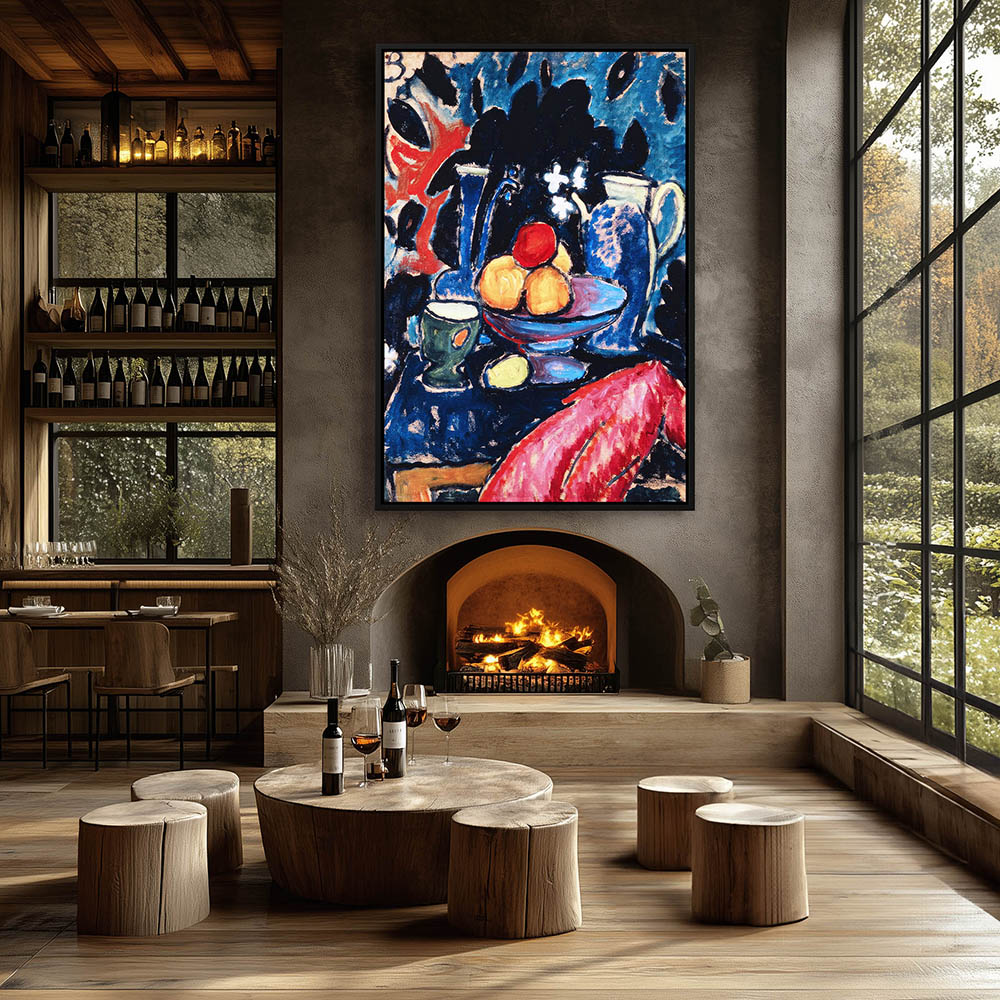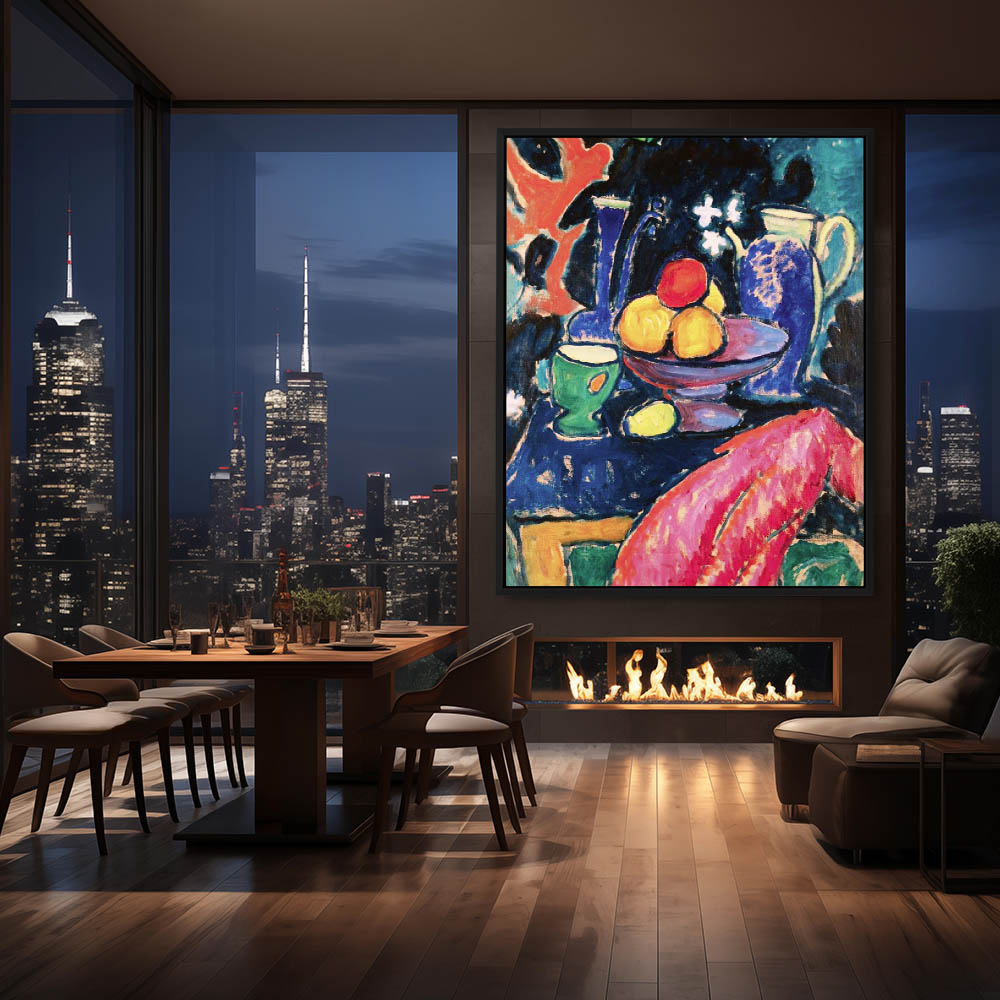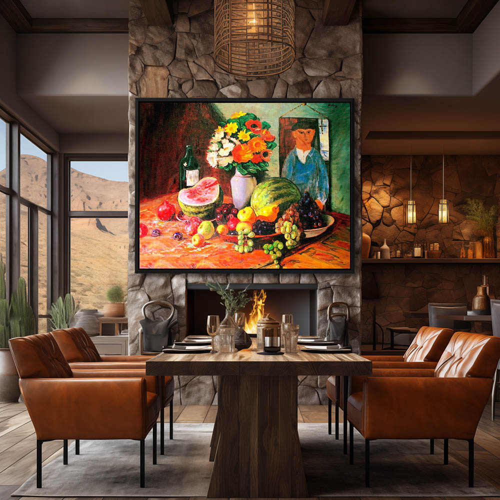Abstract Still Life with Fruit Flowers and a Portrait on the Wall