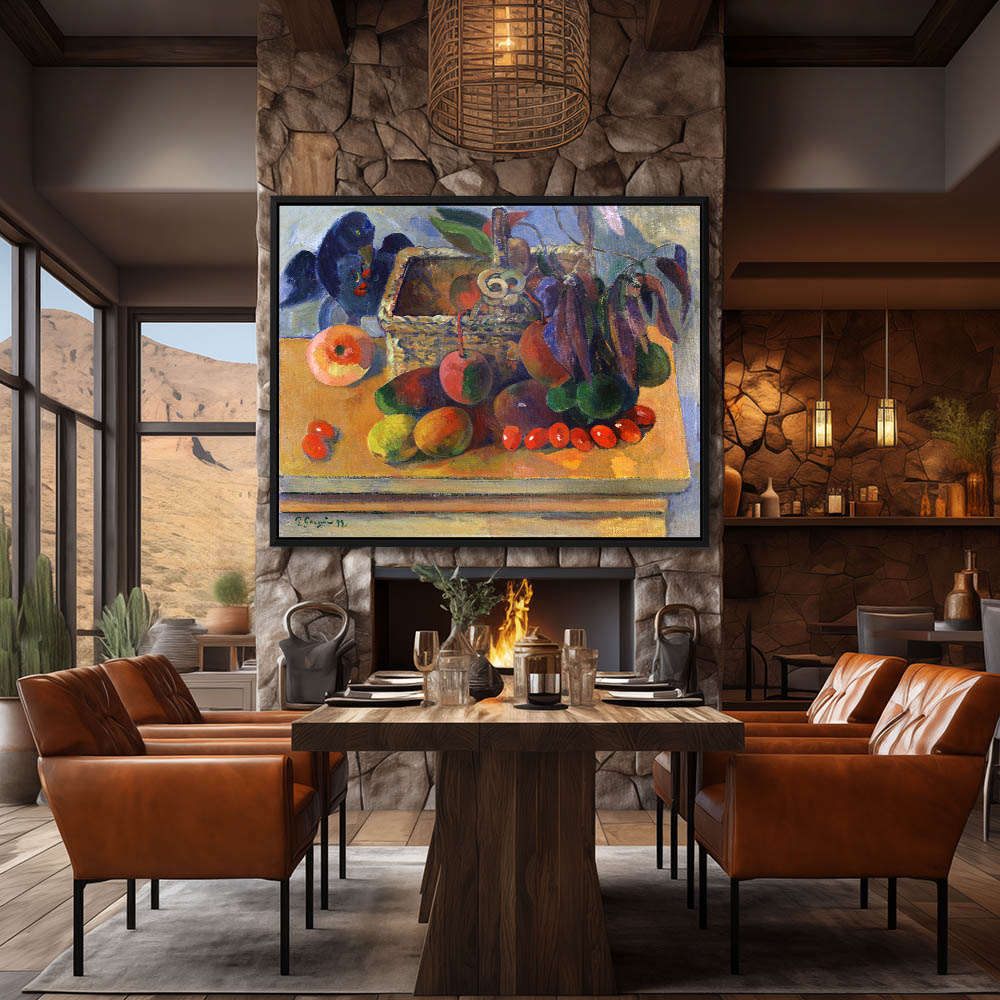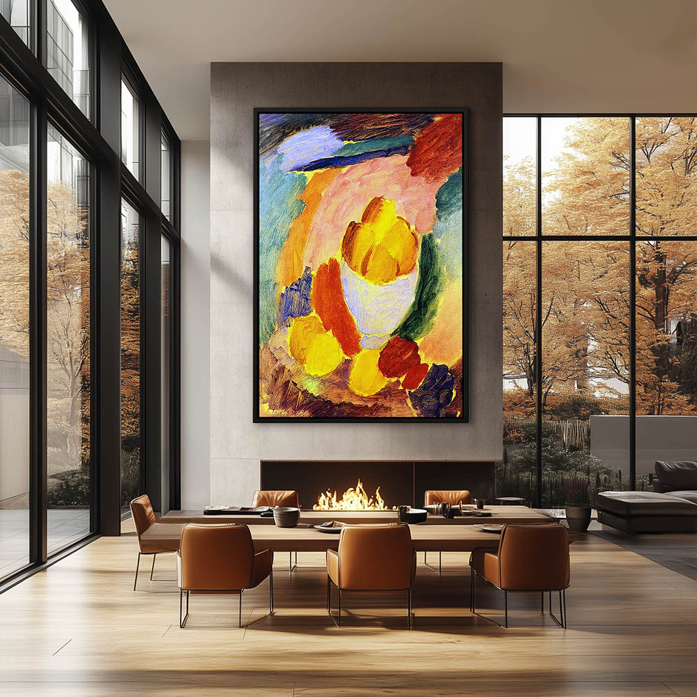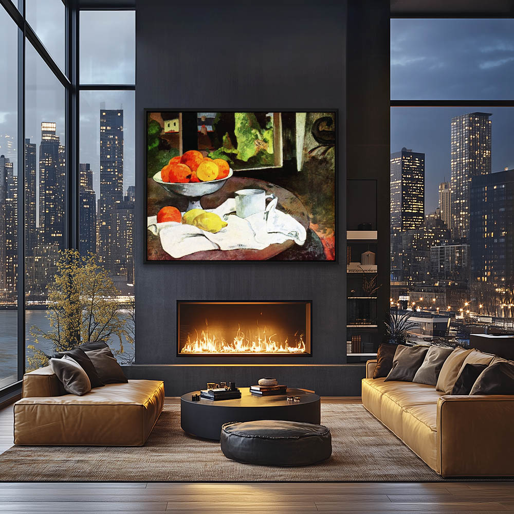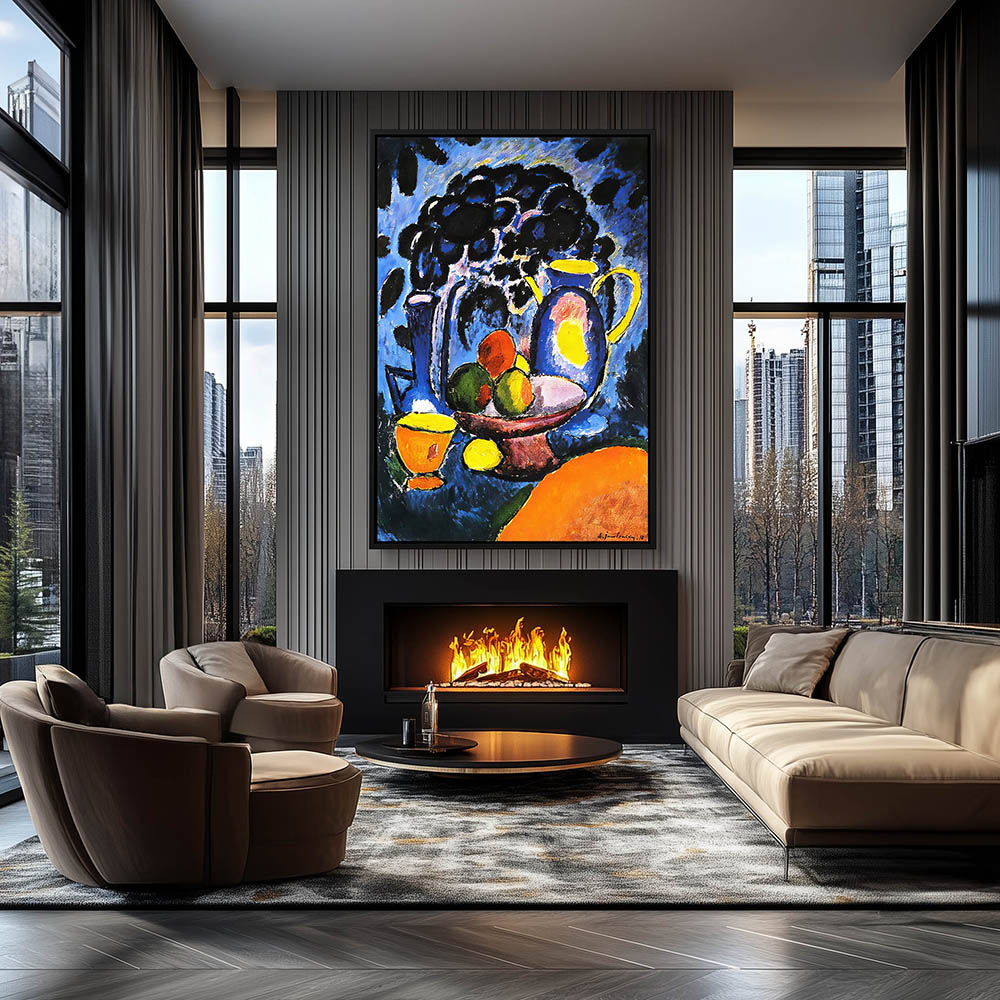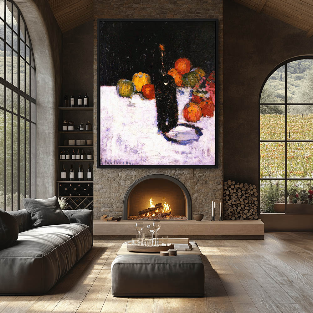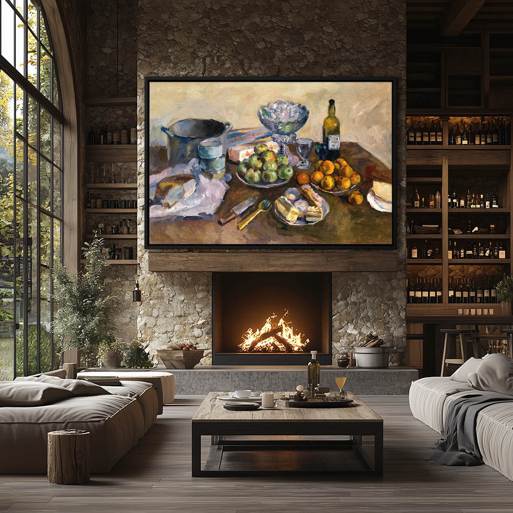 Abstract Still Life Painting with a Set Table and Flowers and Fruit