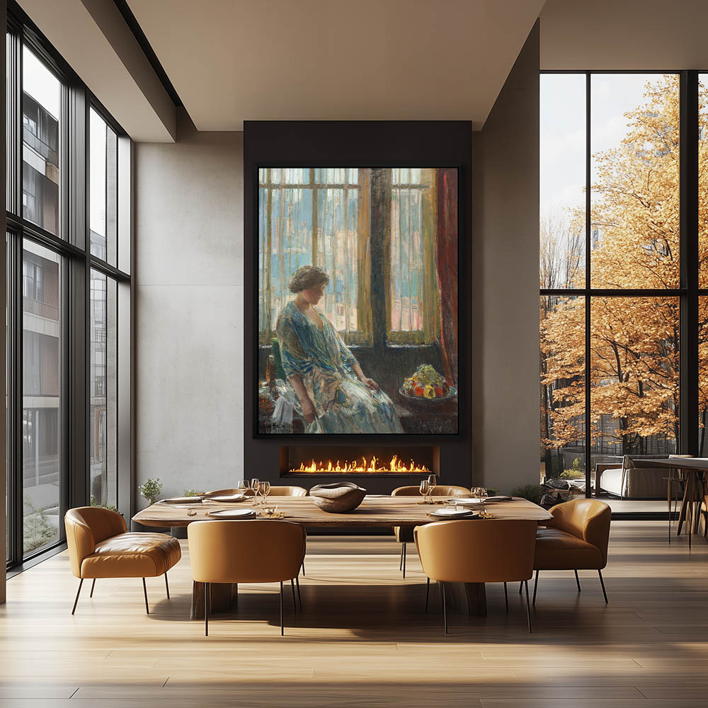 Woman sitting by a window with a bowl of fruit
