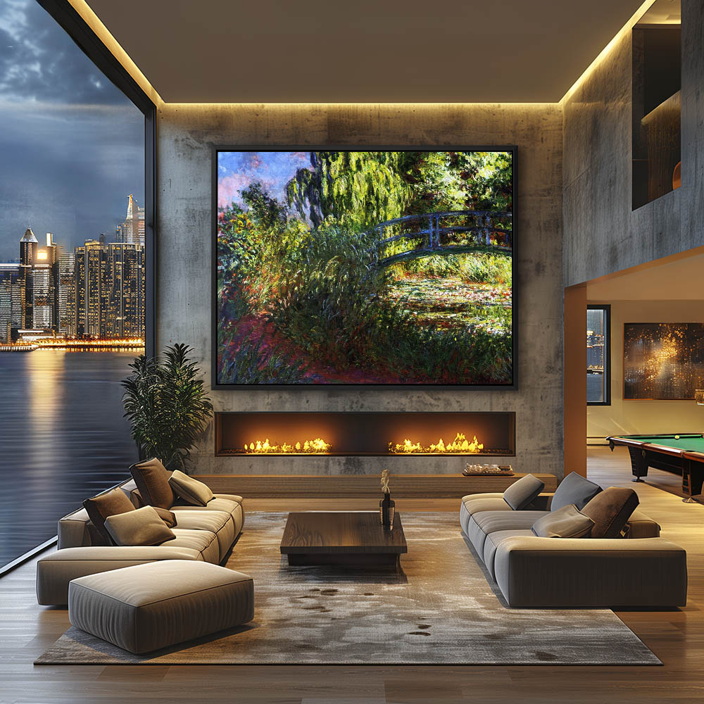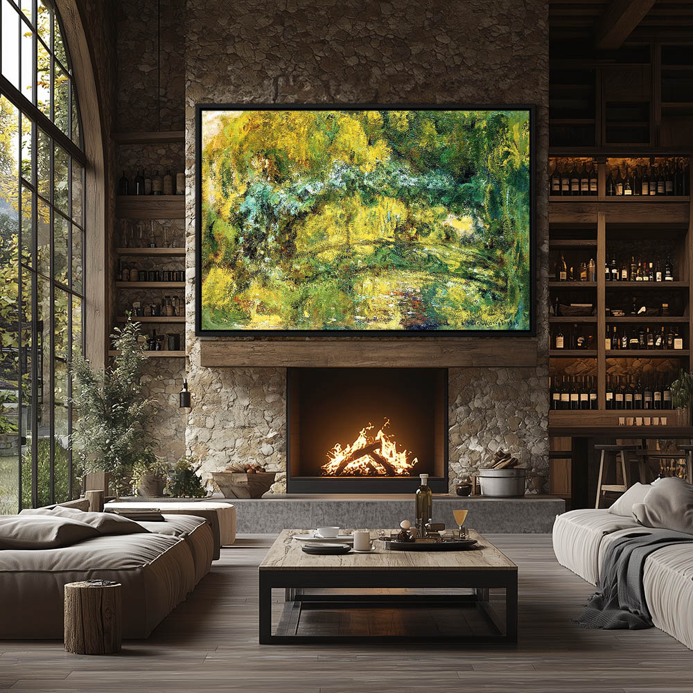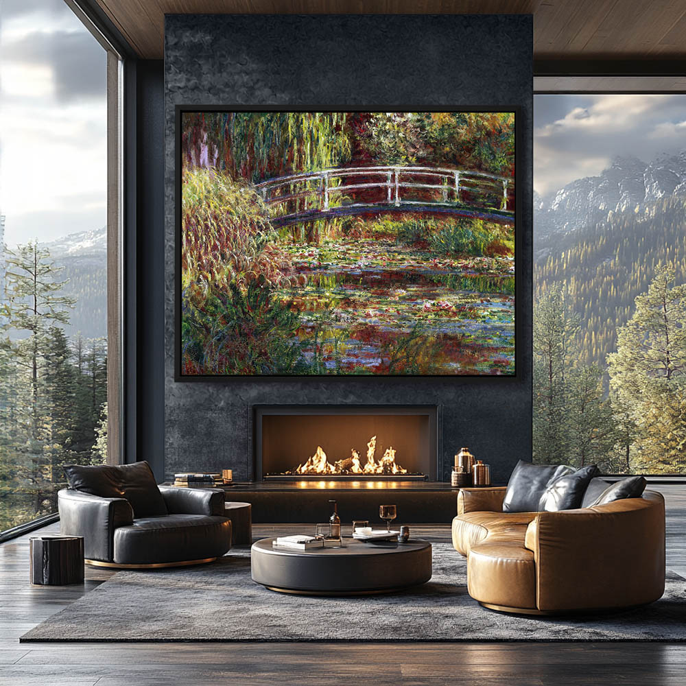 Vintage Pond Painting of Watter Lillies with a Japanese Bridge over a Pond