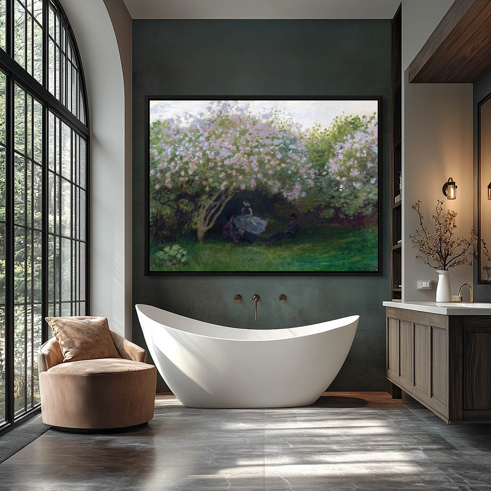 Vintage Landscape Painting with a Woman under the Lilacs in Bloom