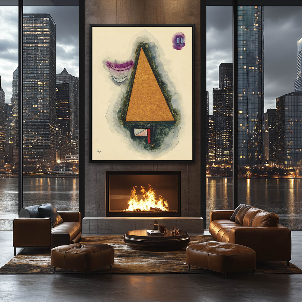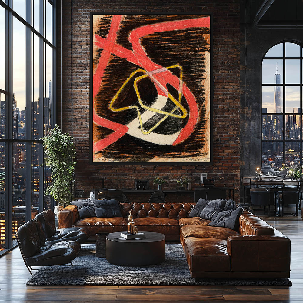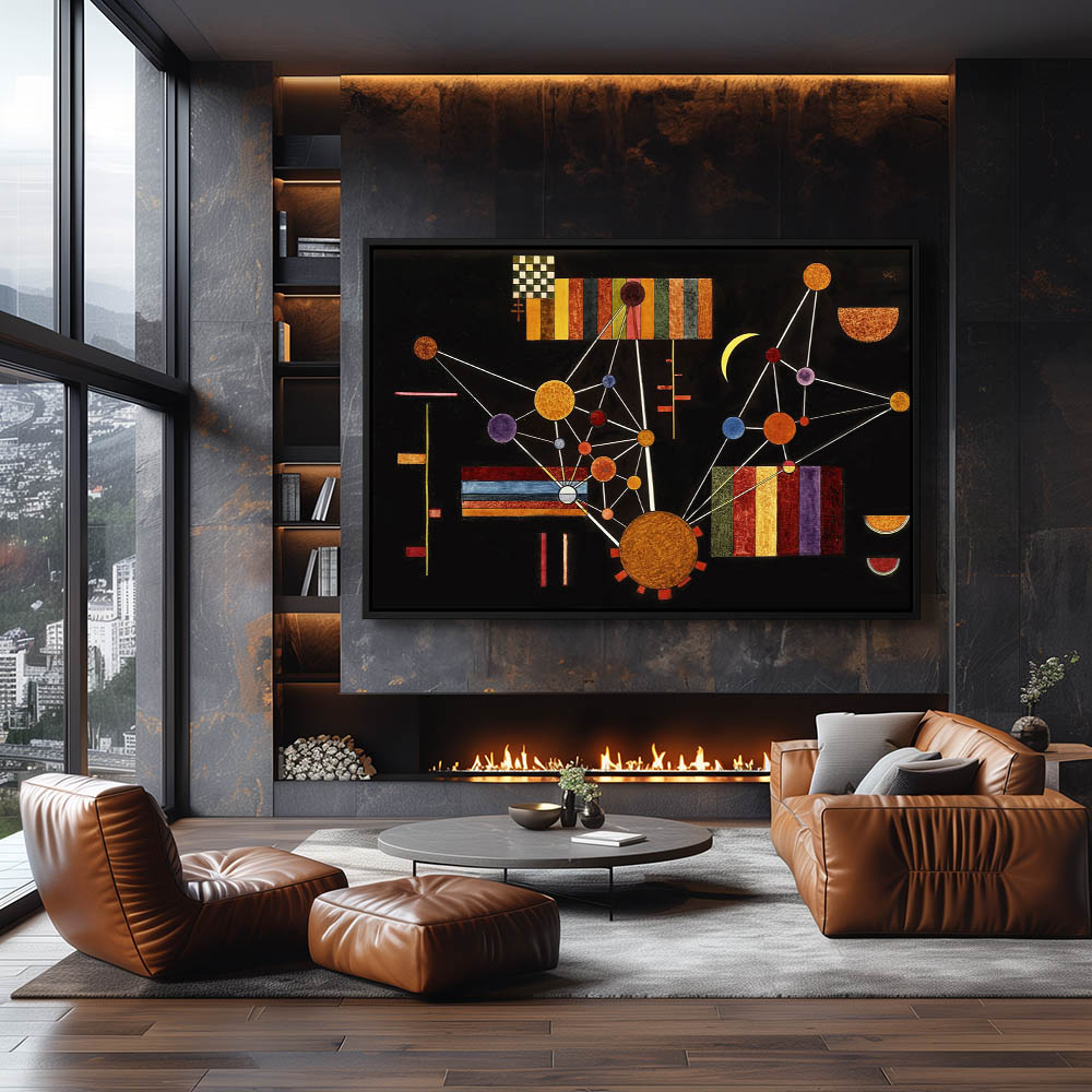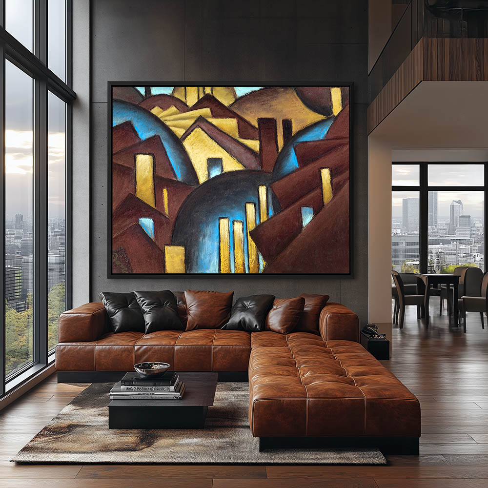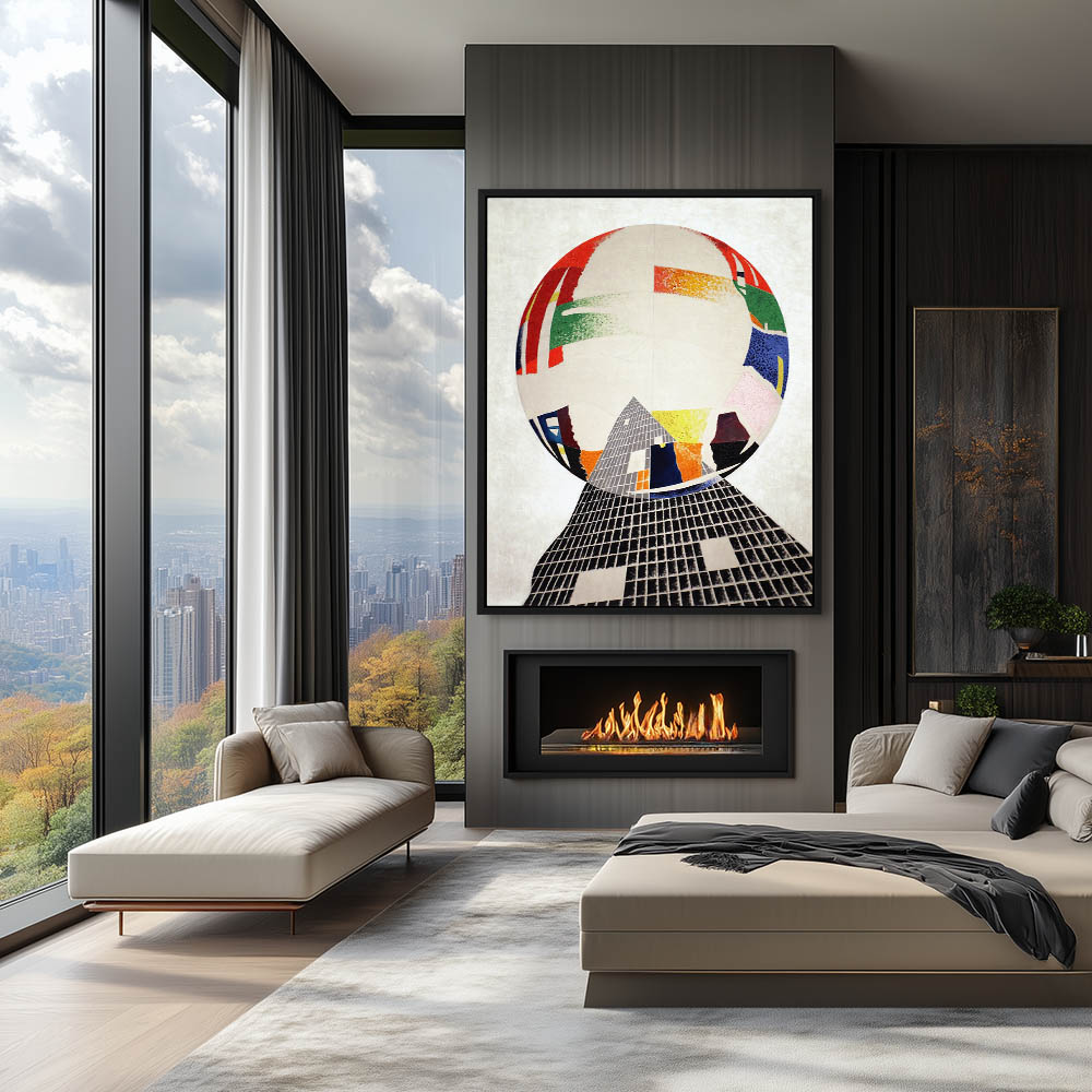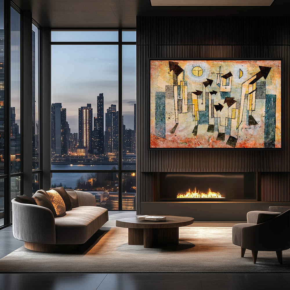 Abstract geometric cityscape with arrows, the sun and crecent moon.