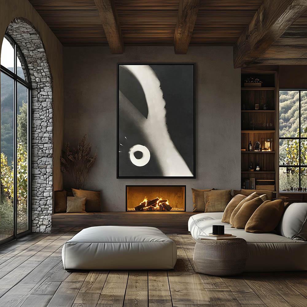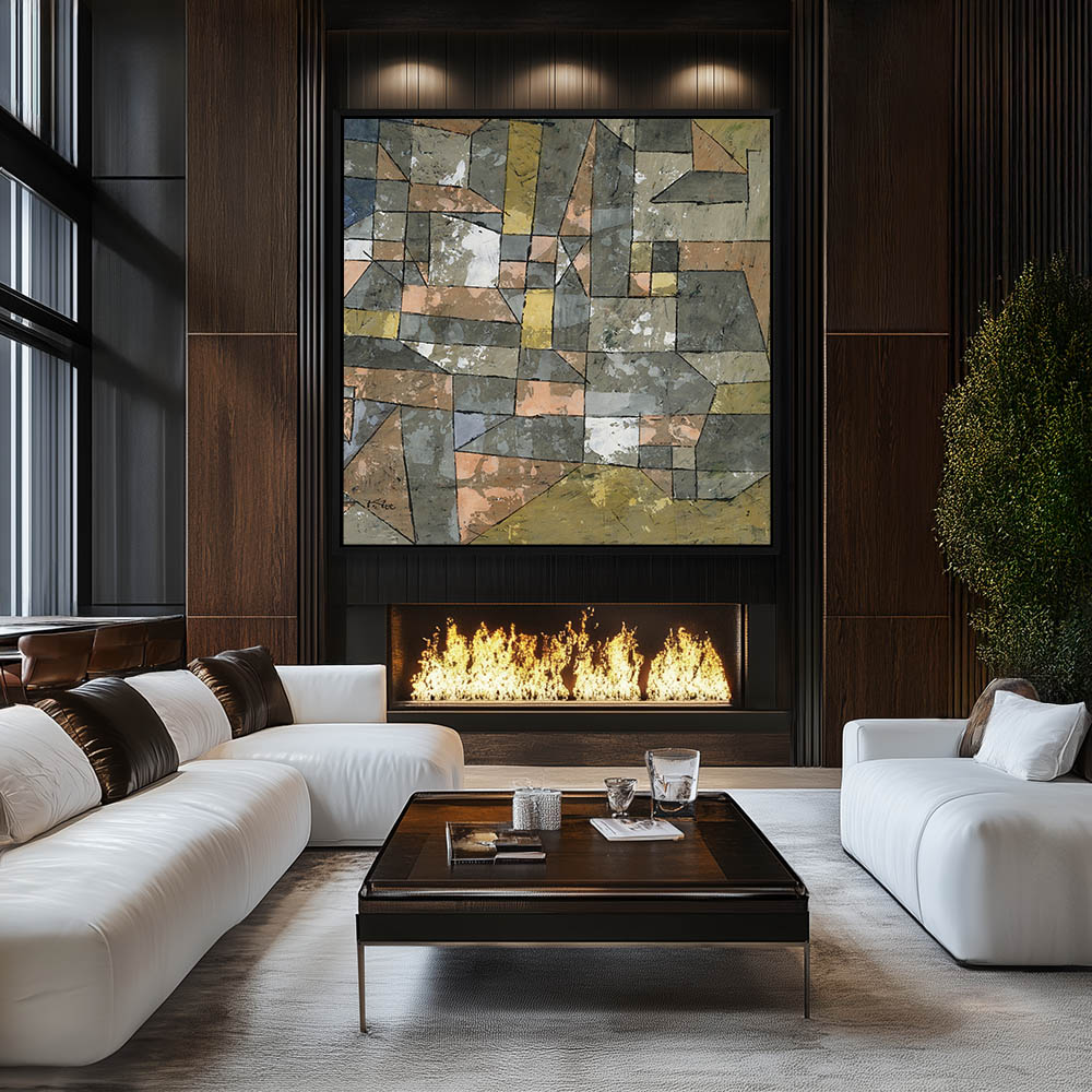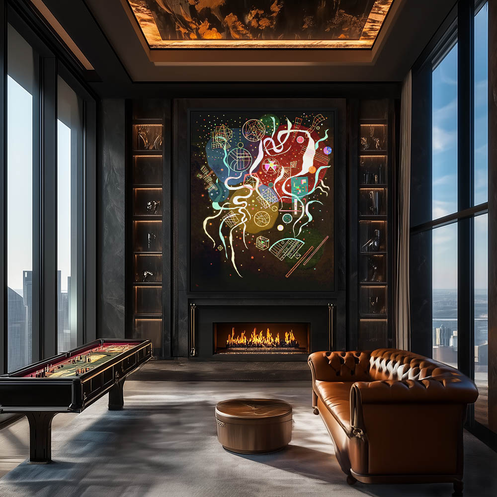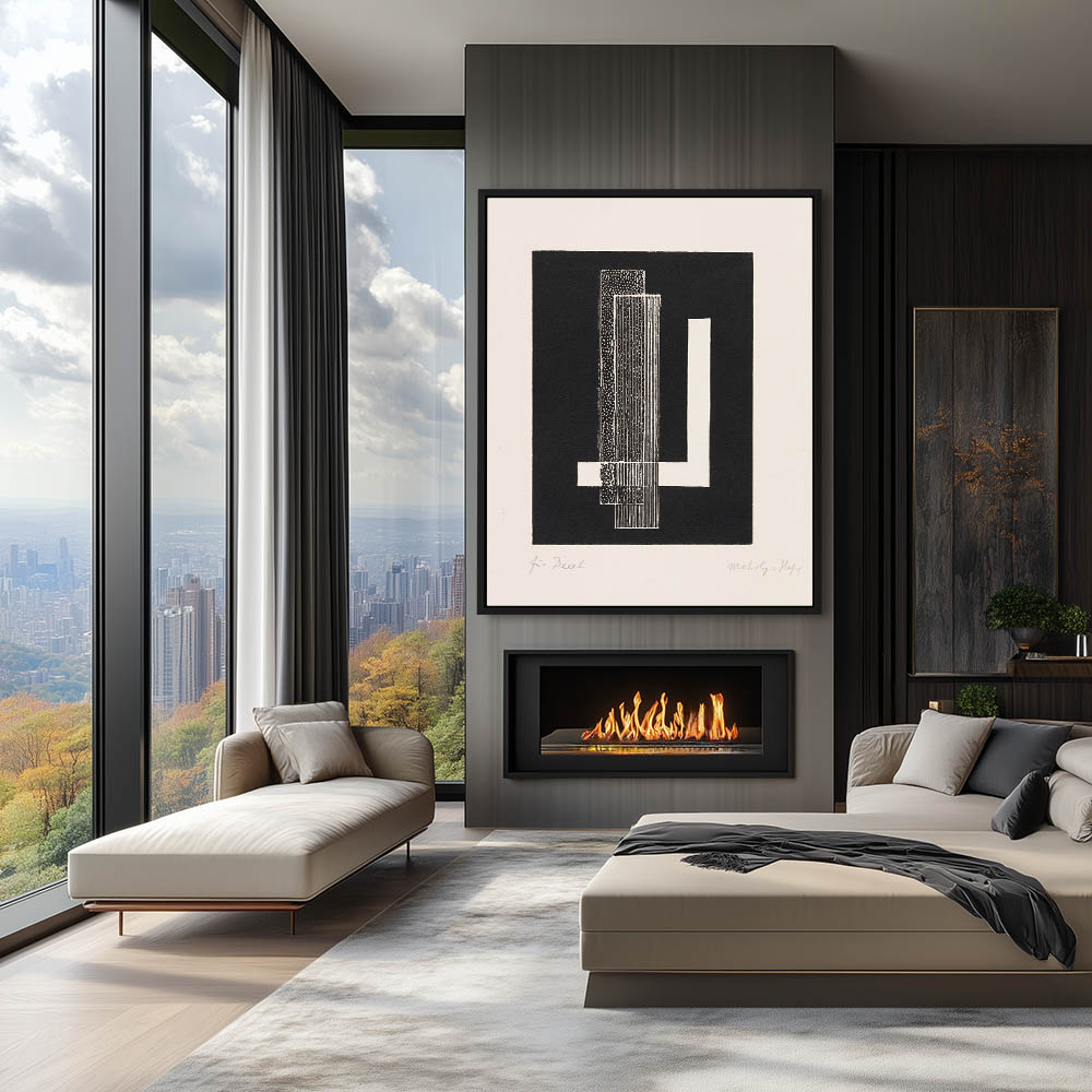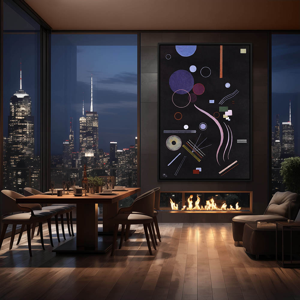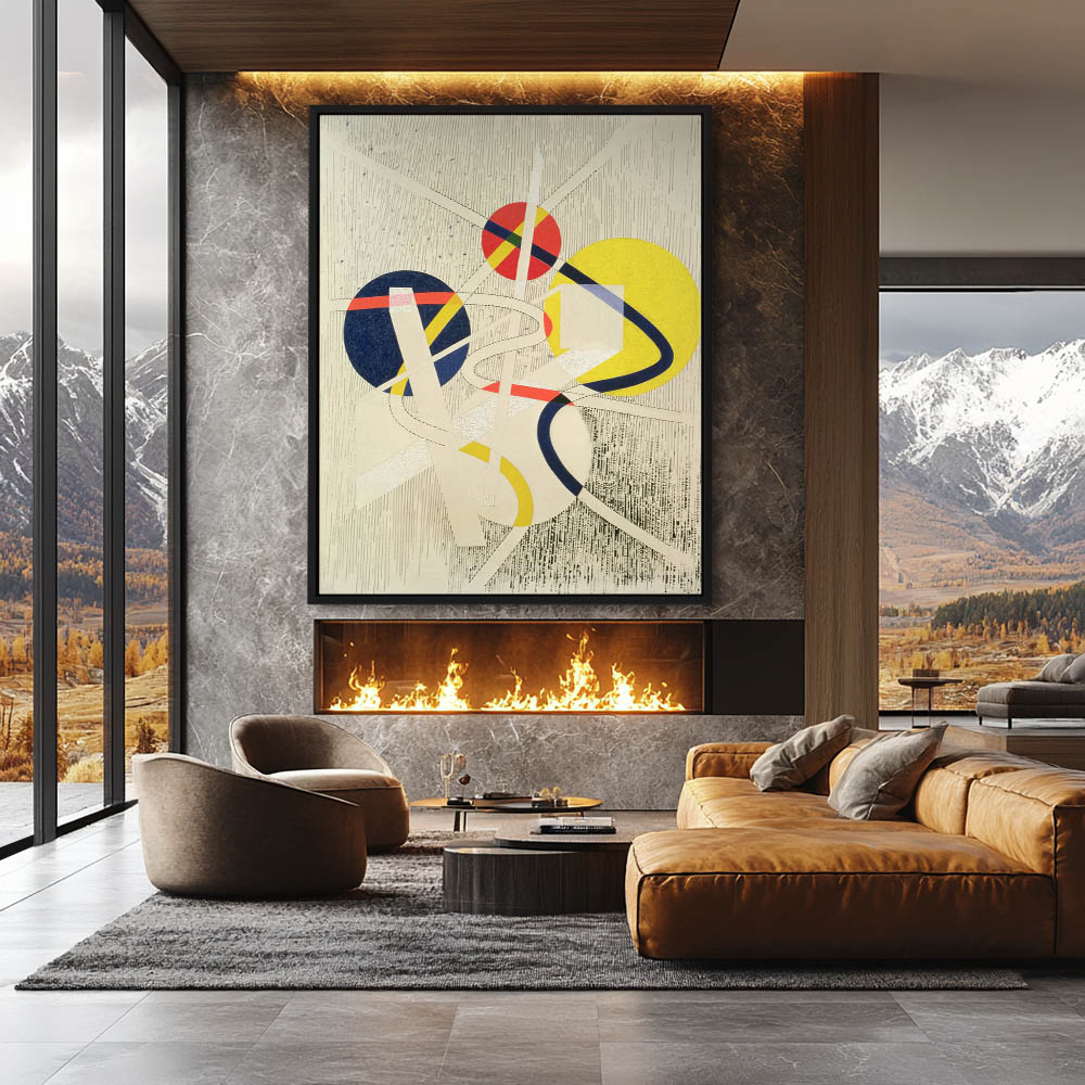 Abstract geometric cityscape with arrows, the sun and crecent moon.