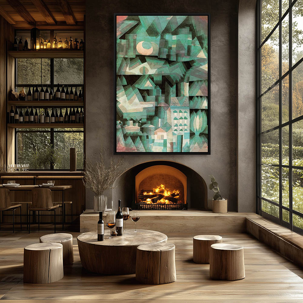 Abstract composition of geometric shapes in shades of green, white and black with orange in the background.