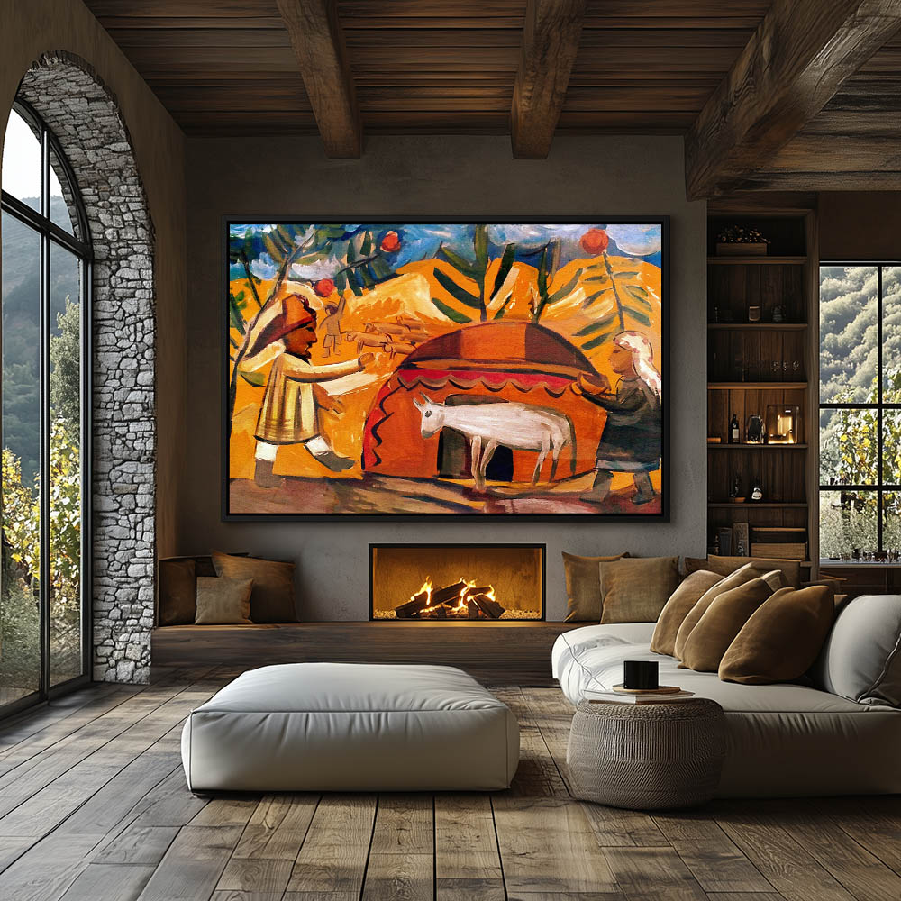 Abstract Landscape Painting with Figures and a Goat near a Yurt
