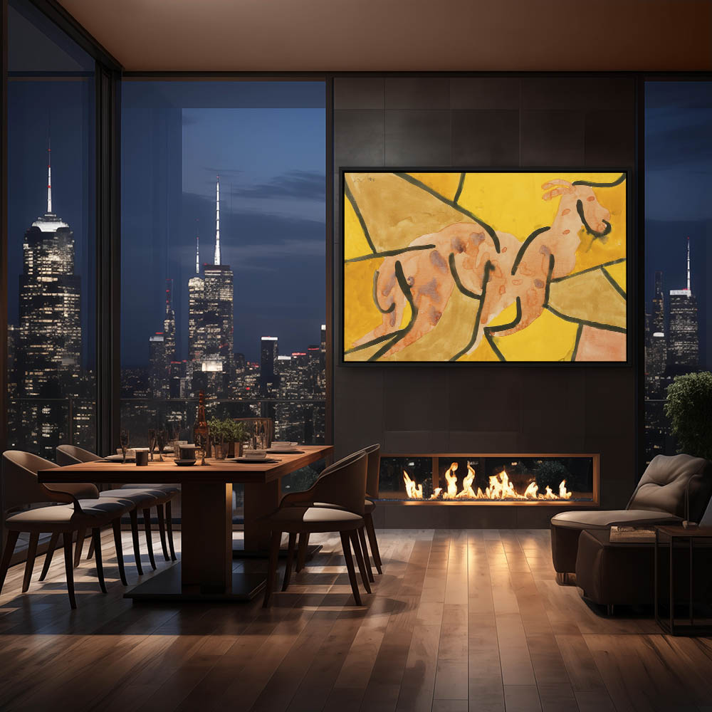Abstract watercolor of a goat on a background of yellow shades devided by heavy black lines
