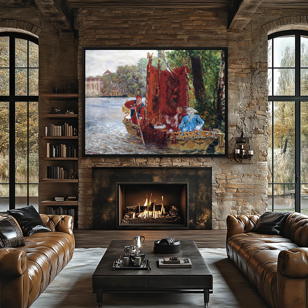 Vintage River Landscape Painting with Figures and Boat on a Lake