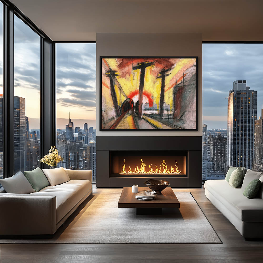 Abstract Landscape with Railroad Tracks and Rising Sun