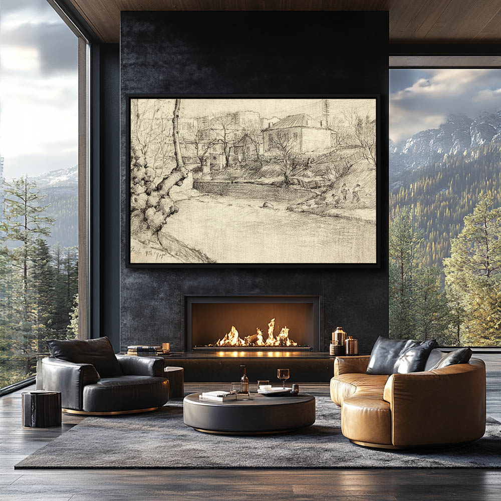 sketch of men along a river bank