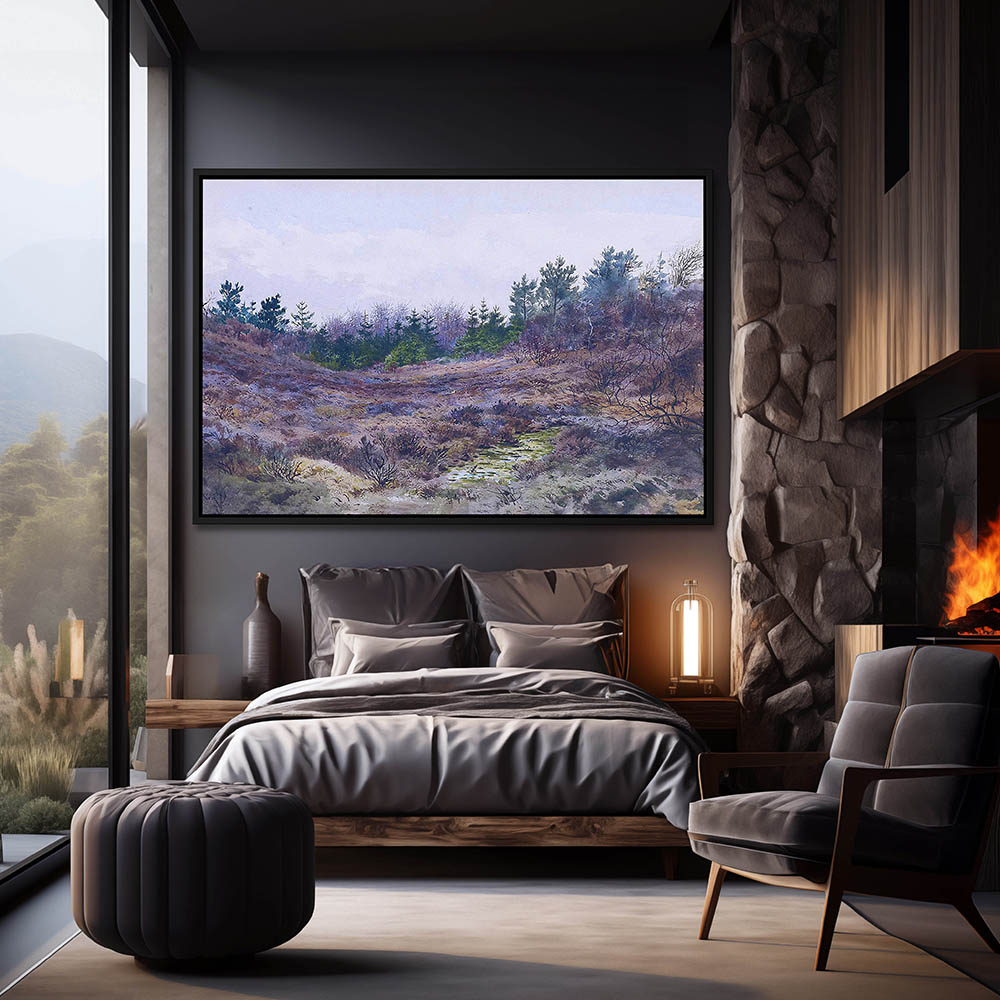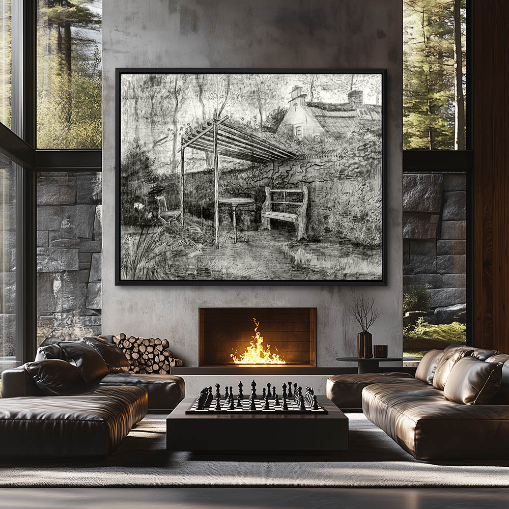 Painting of a Cock Pheasant on a Stump with Three Hens Forging in Black and White