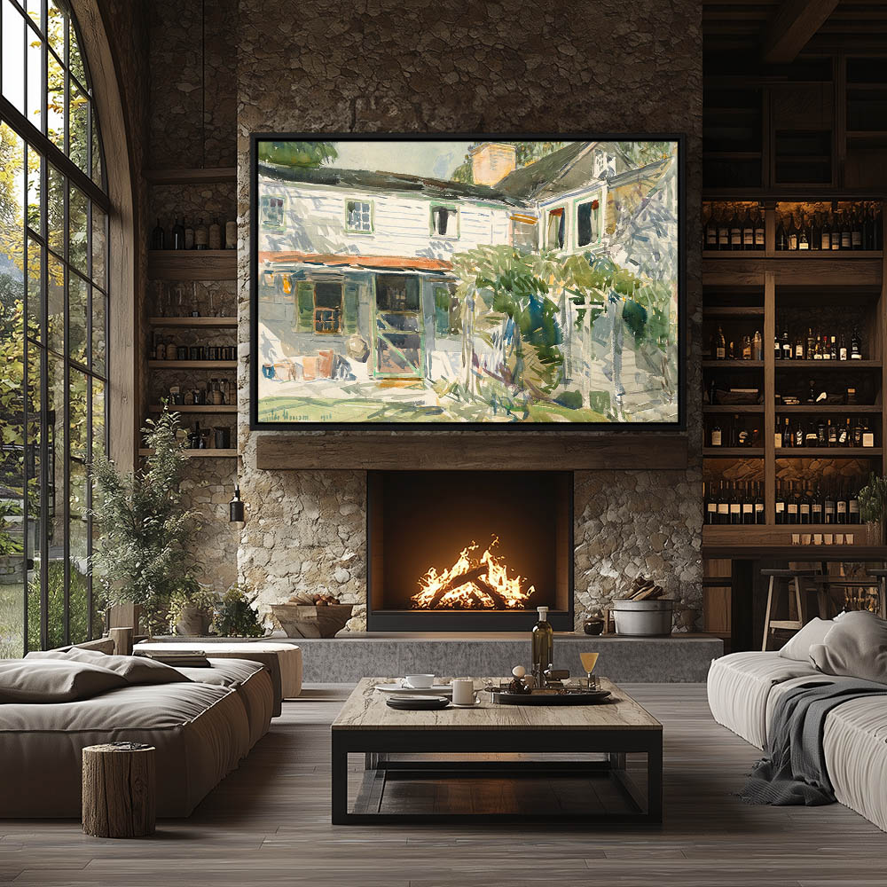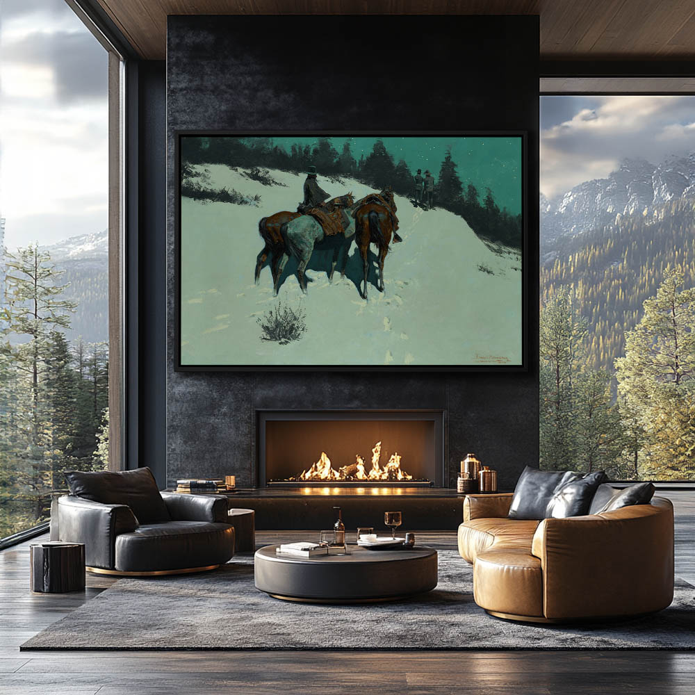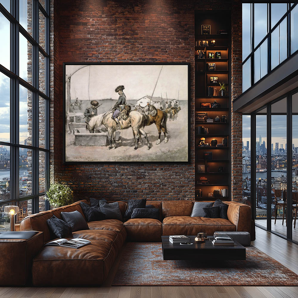 Two cowboys on horseback stopping the horse of a third man who has fallen off, while a skirmish with the Indians is taking place