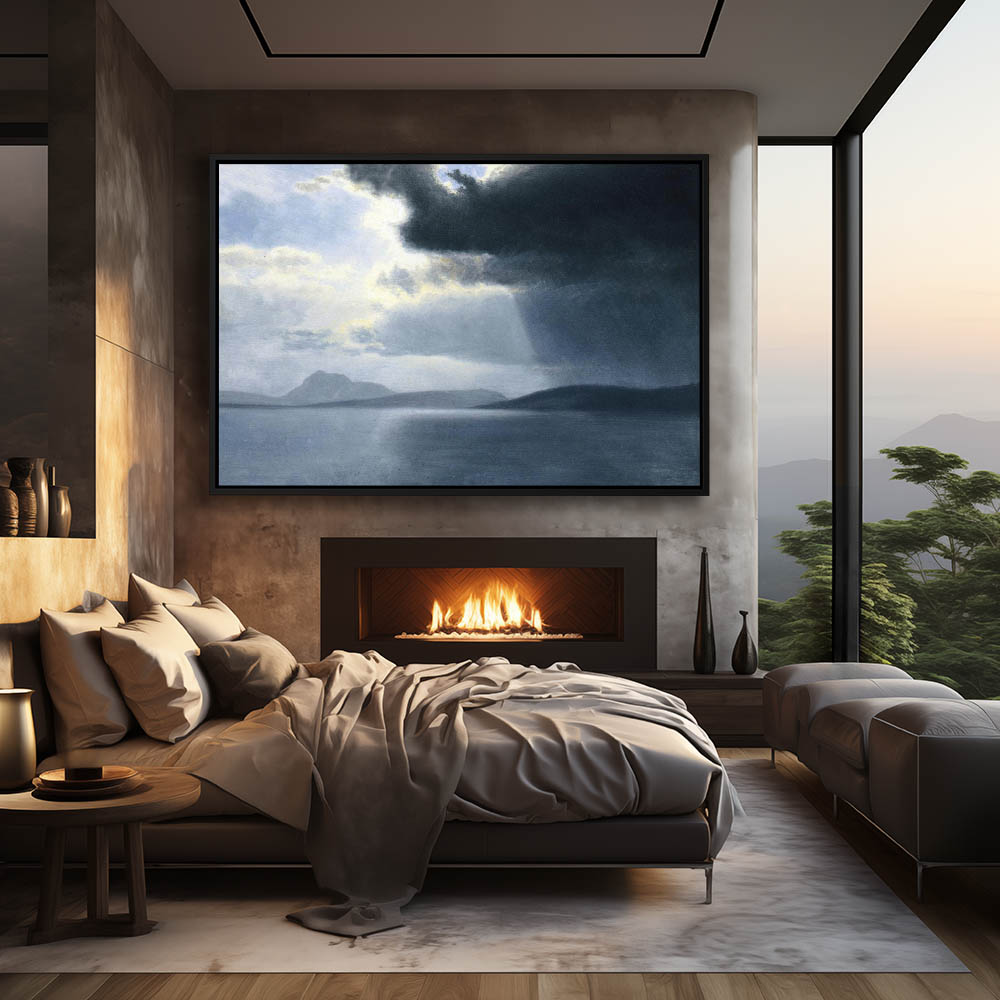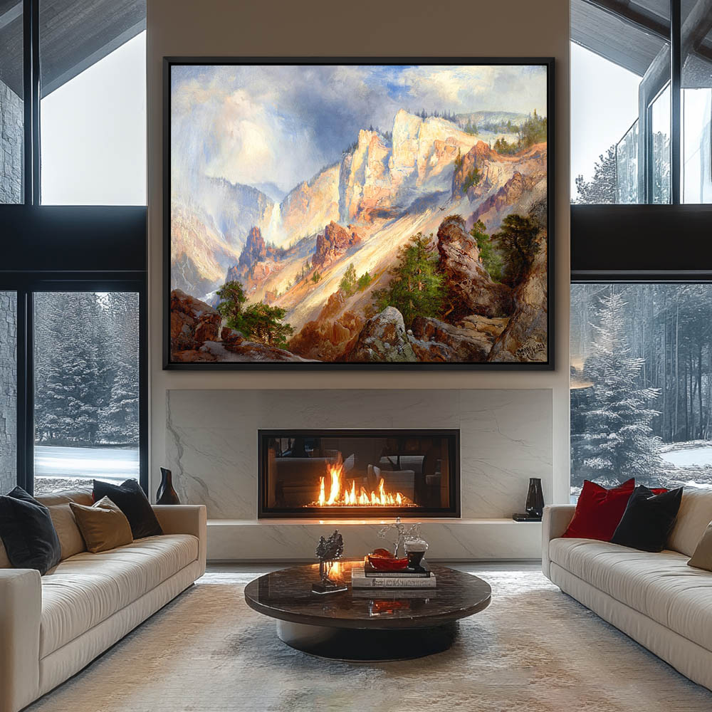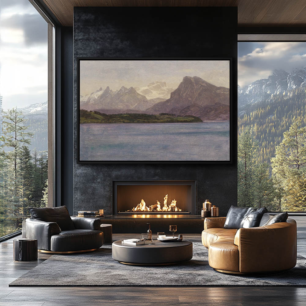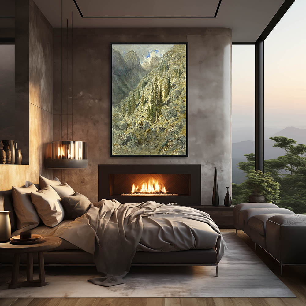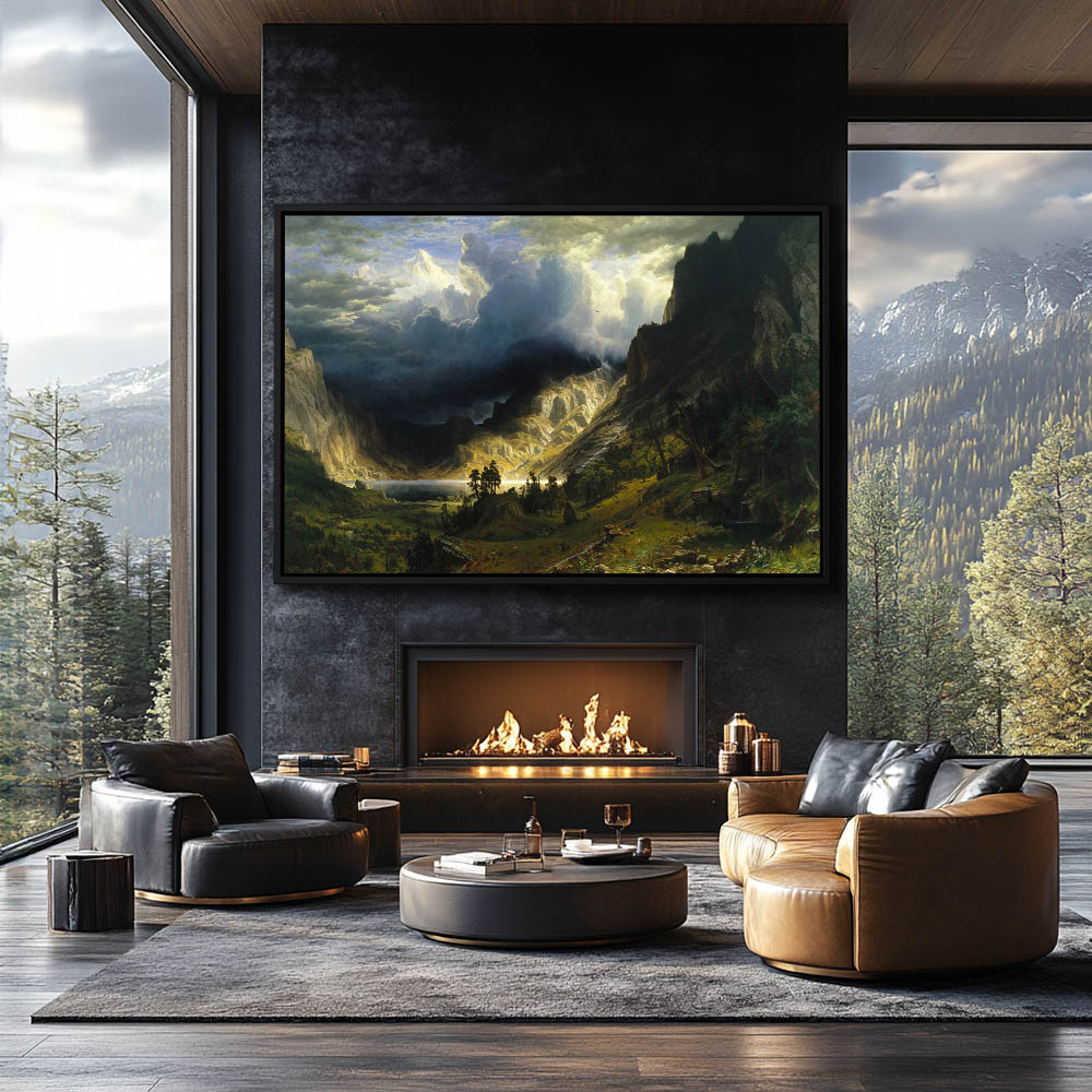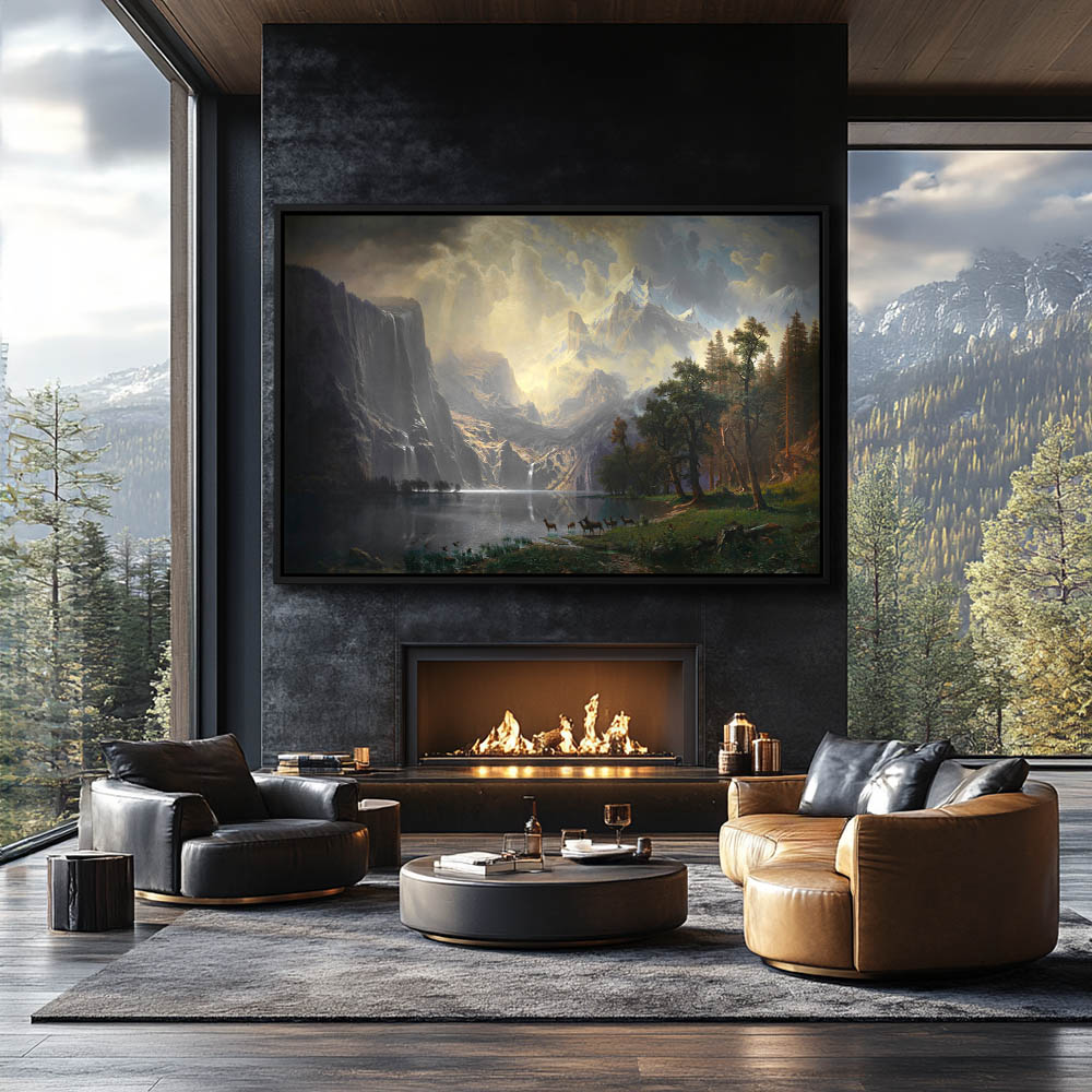Lake fed by waterfalls at the foot of the Sierra Nevada Mountains with deer and birds at the treelined shore