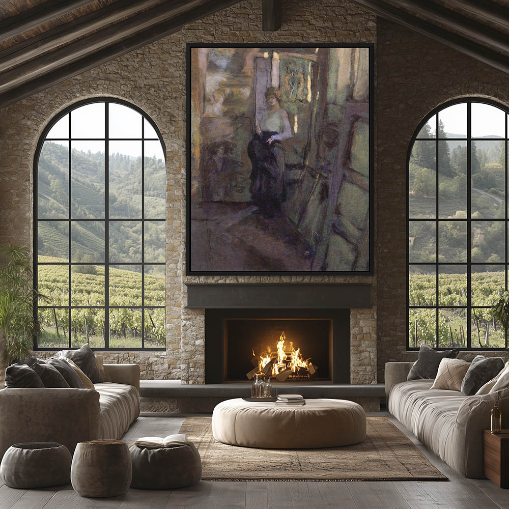 Woman standing in the artists studio hat in hand surrounded by paintings and canvases.
