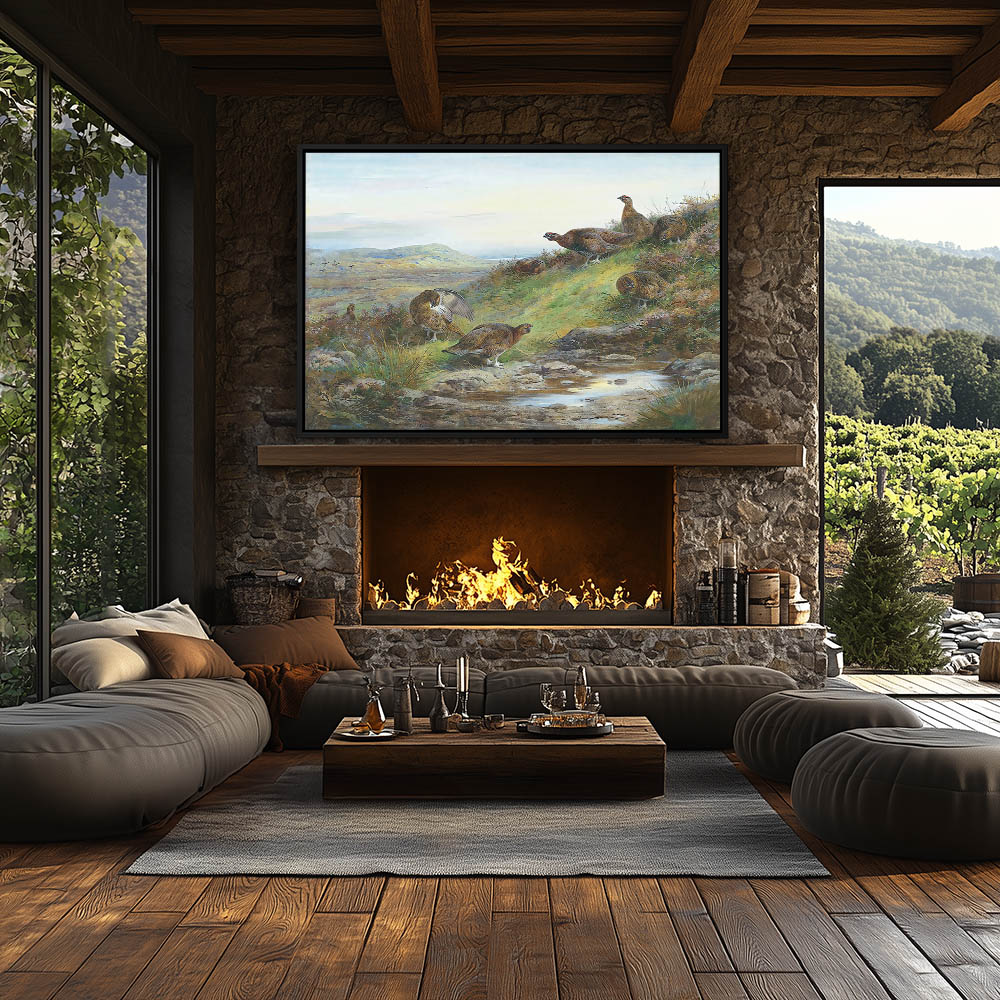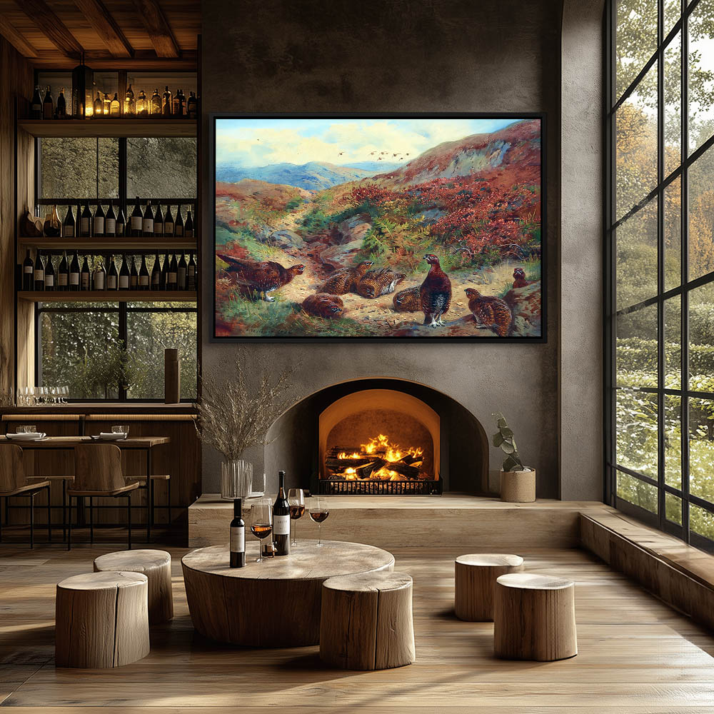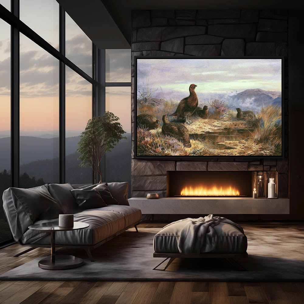 Open Landscape Painting with Cock and Hen Grouse