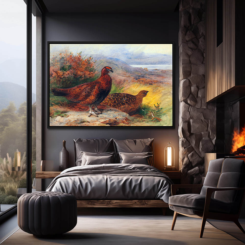 Painting of Red Grouse Perched on a Rock near the Grass