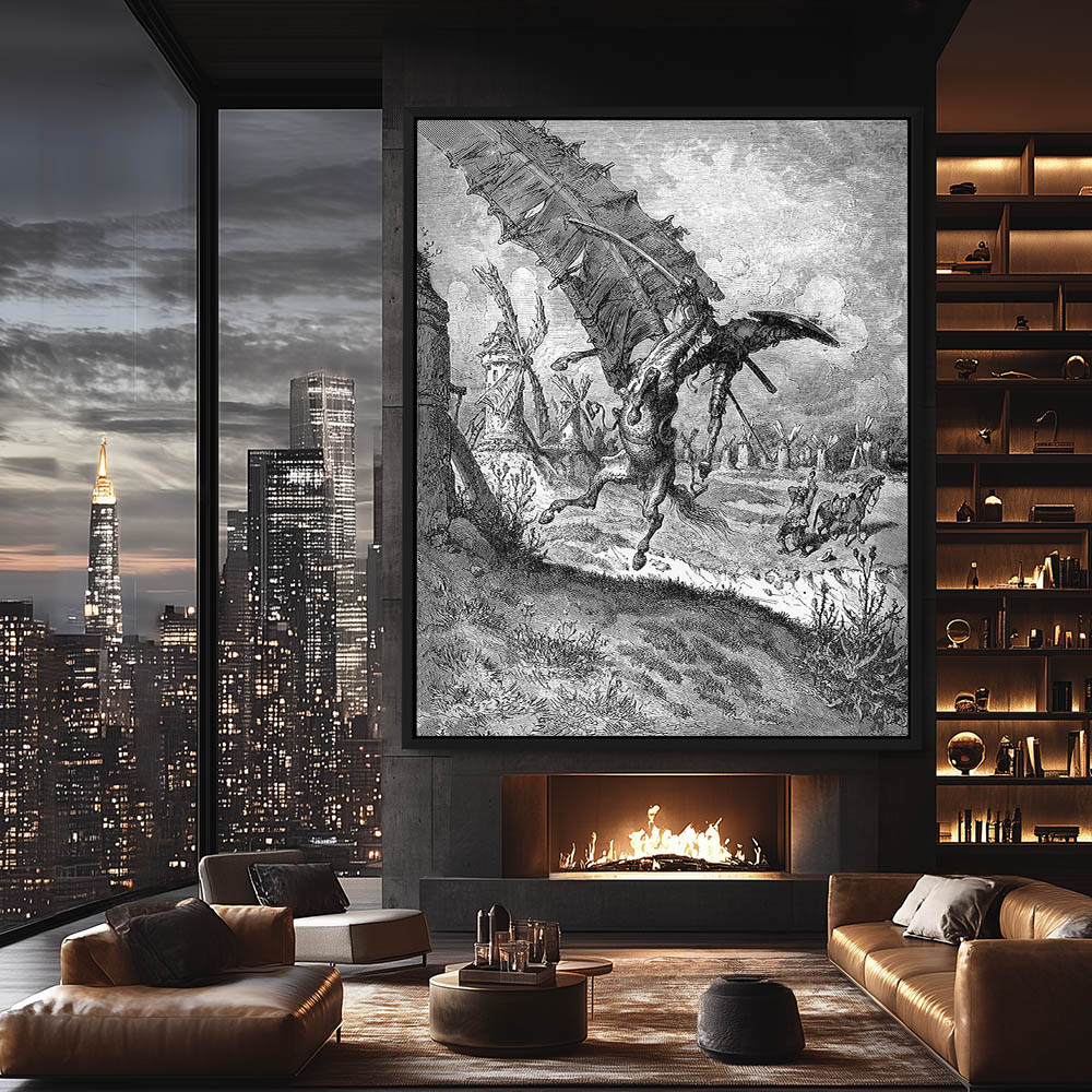 Vintage Etching of The Adventure with the Windmills