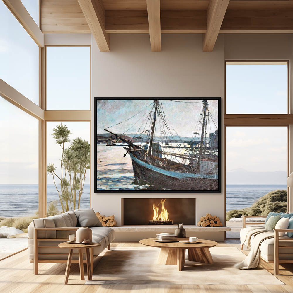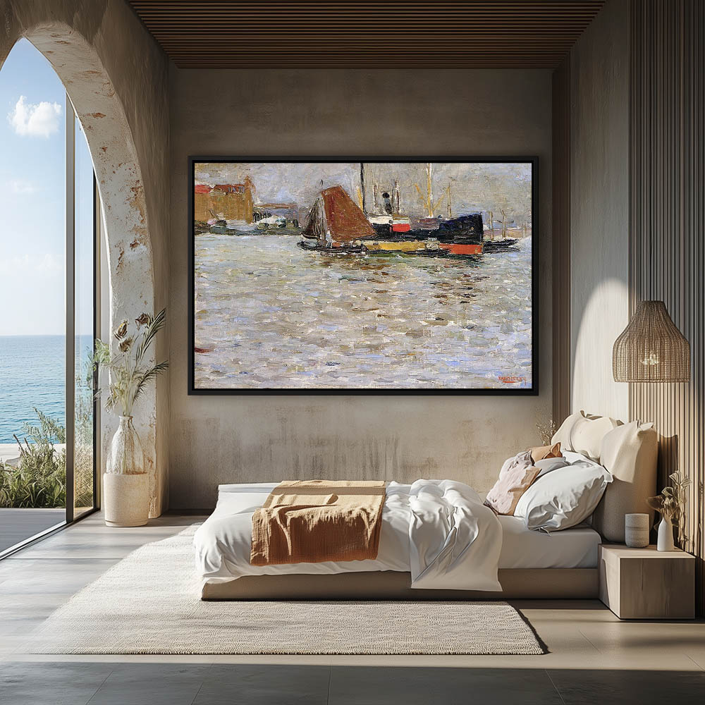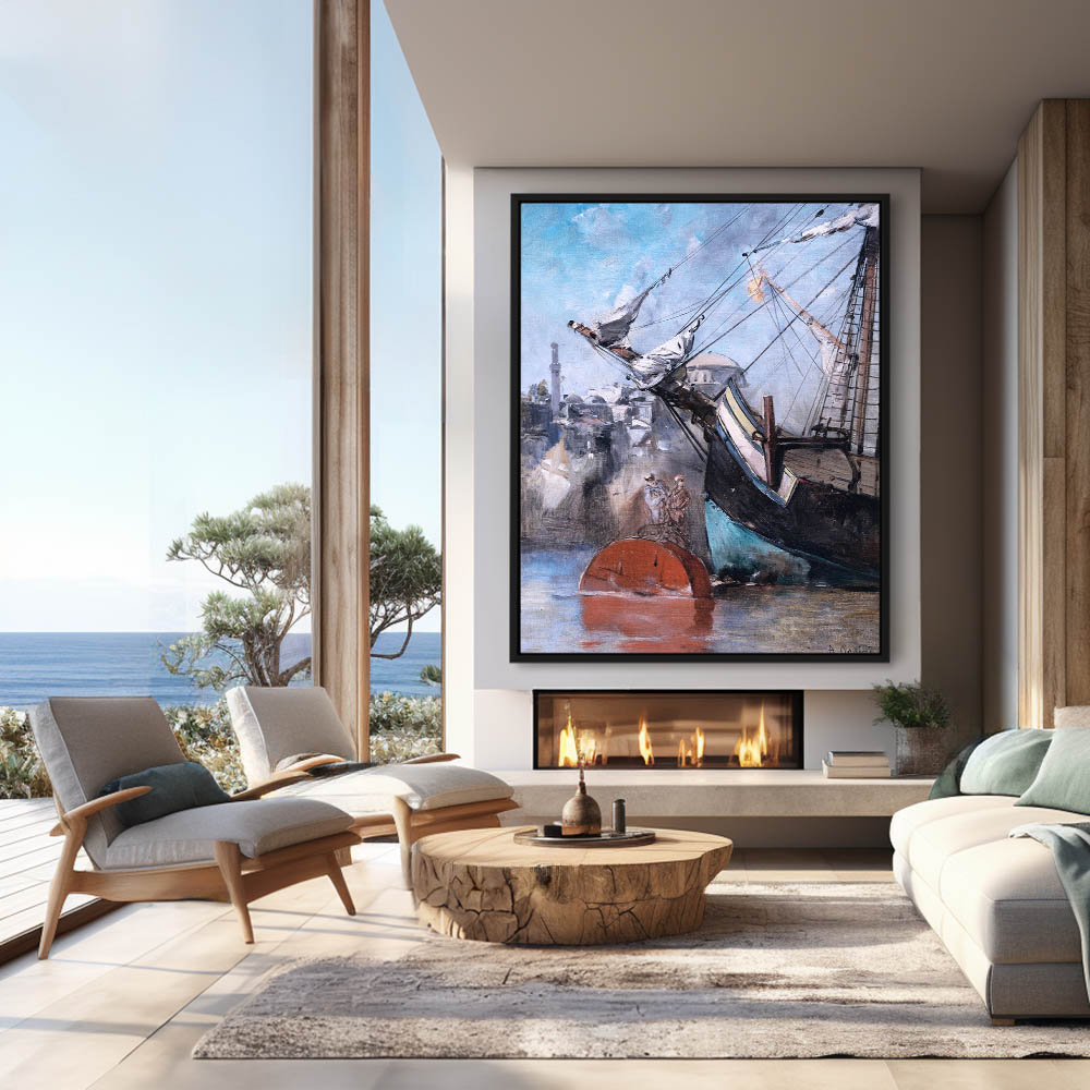 Vintage Harbor Sea Scape Painting with Sailboats at Sea