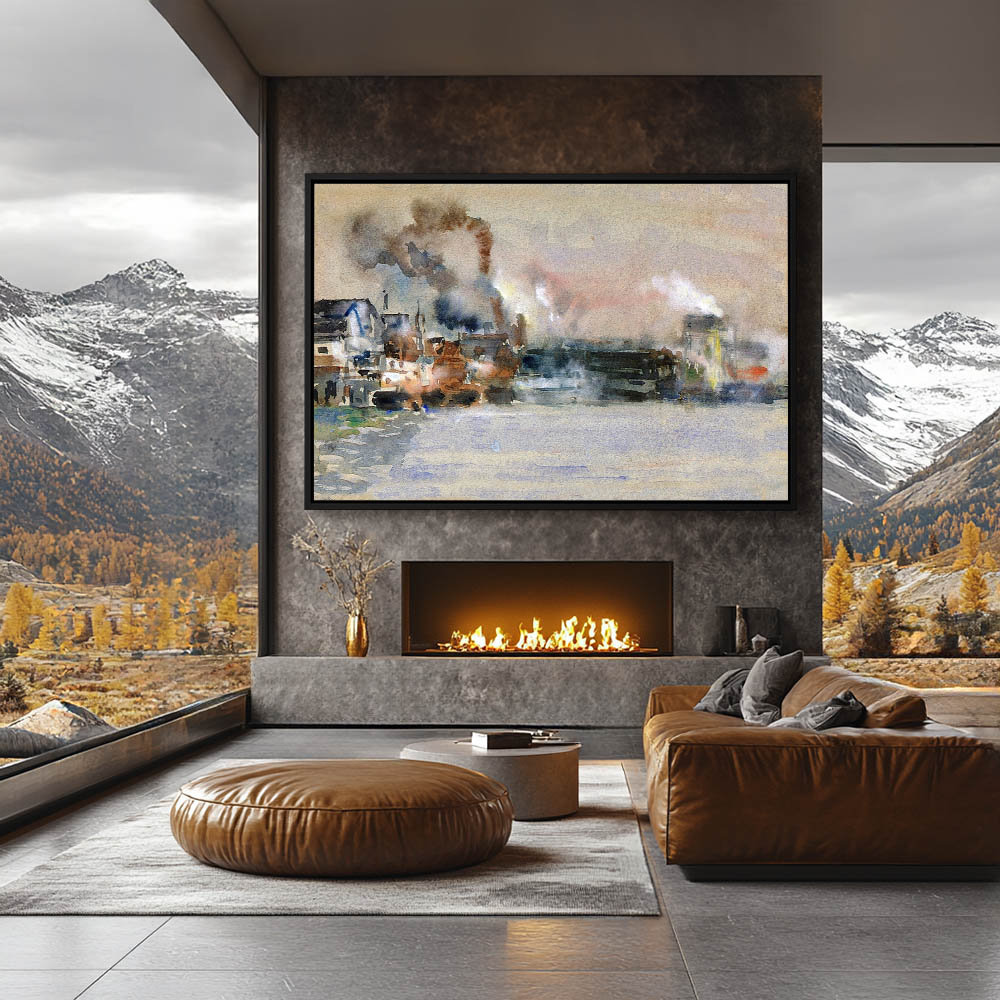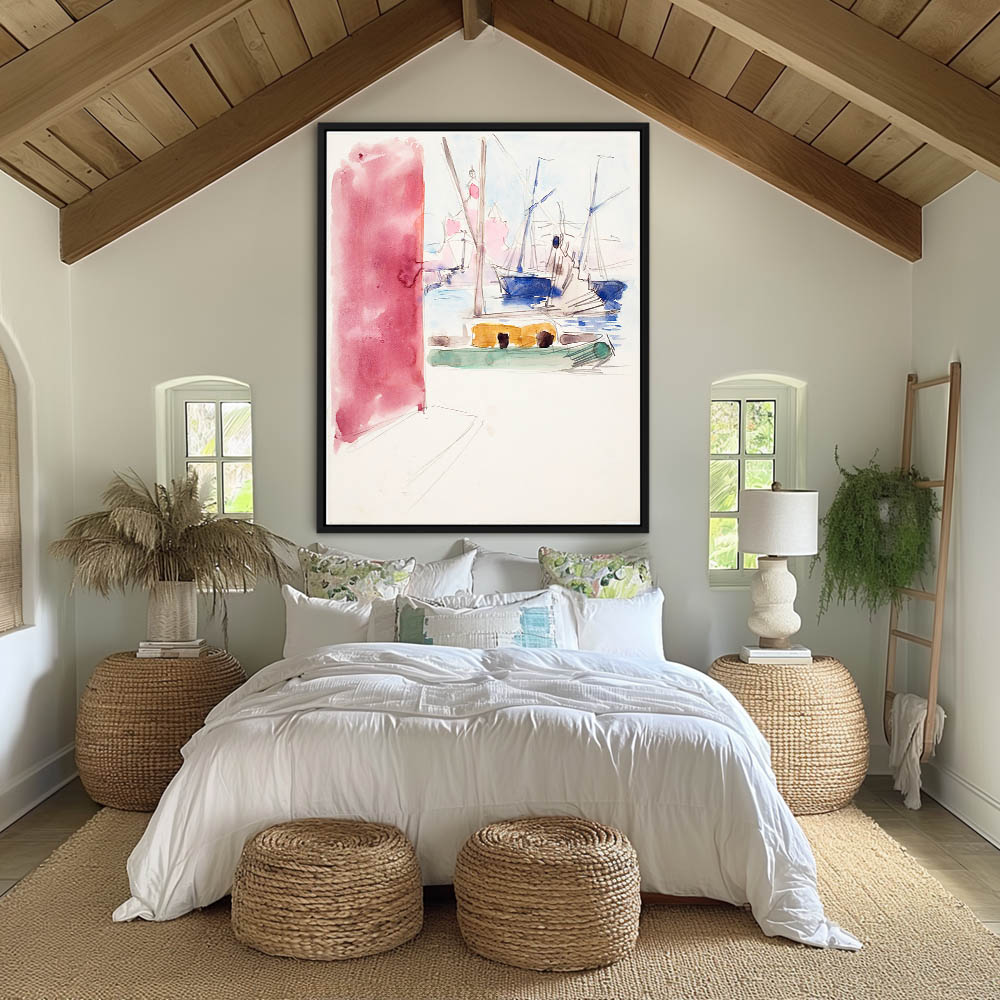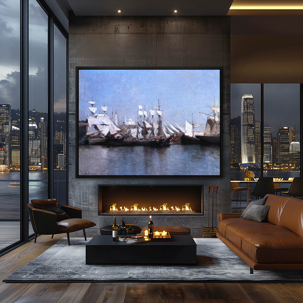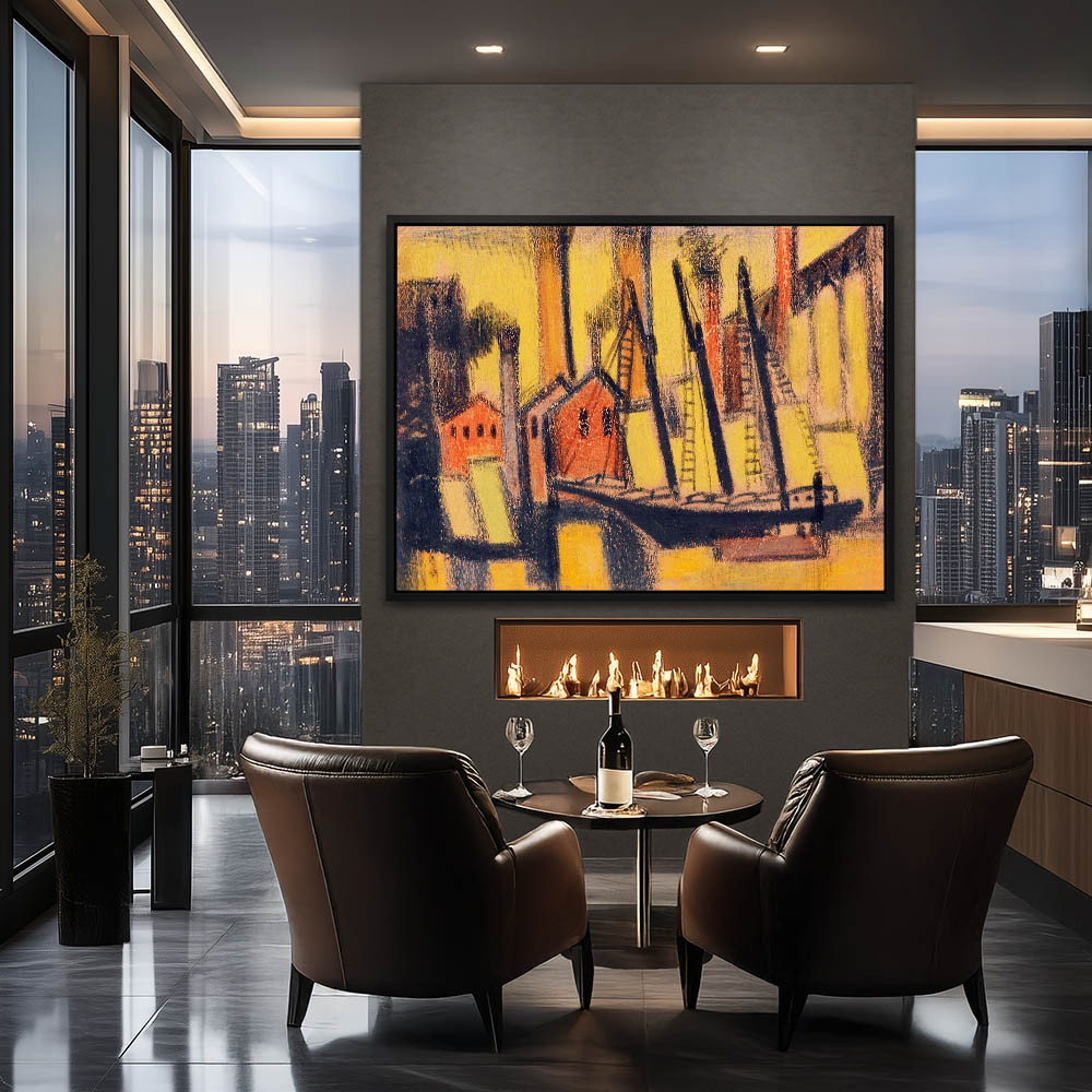 Vintage Harbor Sea Scape Painting with Sailboats at Sea