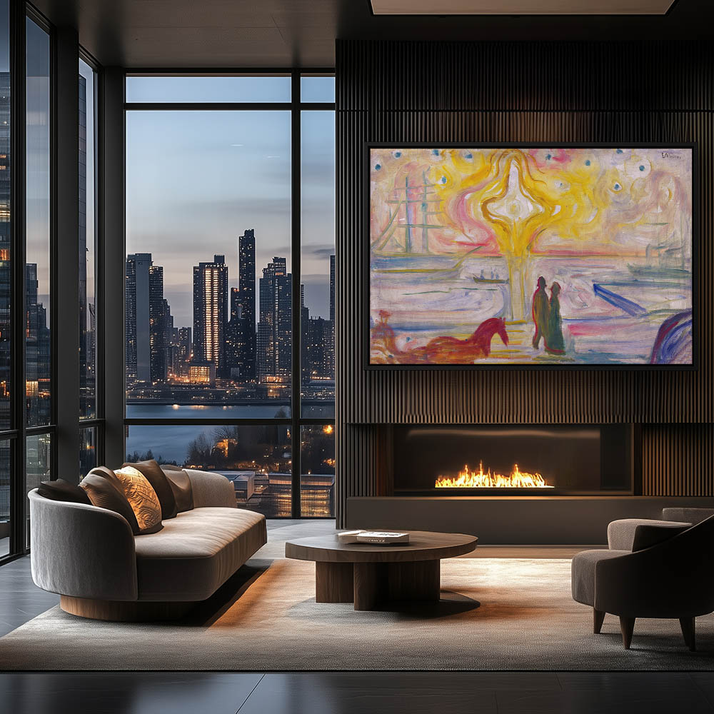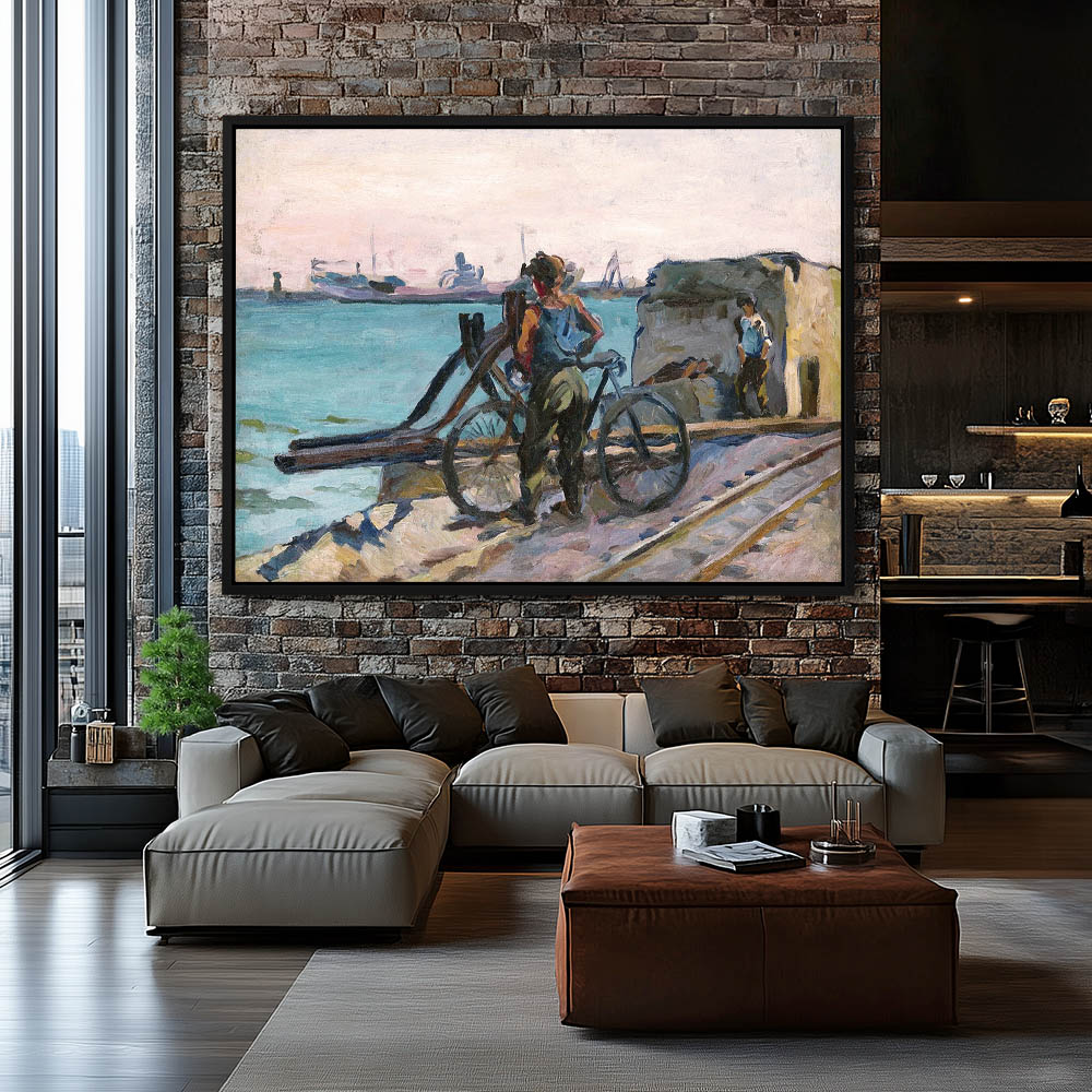 Abstract Coastal Painting with a Figure on a Pier with a Bike watching the Ships at Sea