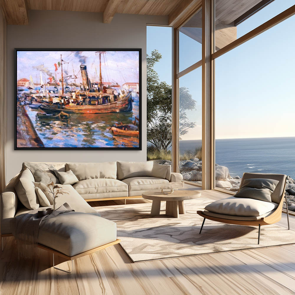 Marine Harbor Painting with a Tugboat in the Port of Viareggio