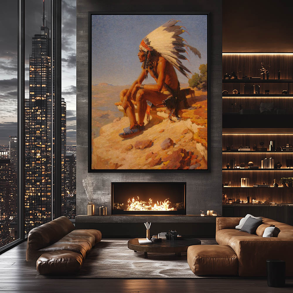 Indian with feathered headdress and moccasins sitting on a ridge looking out over the plains