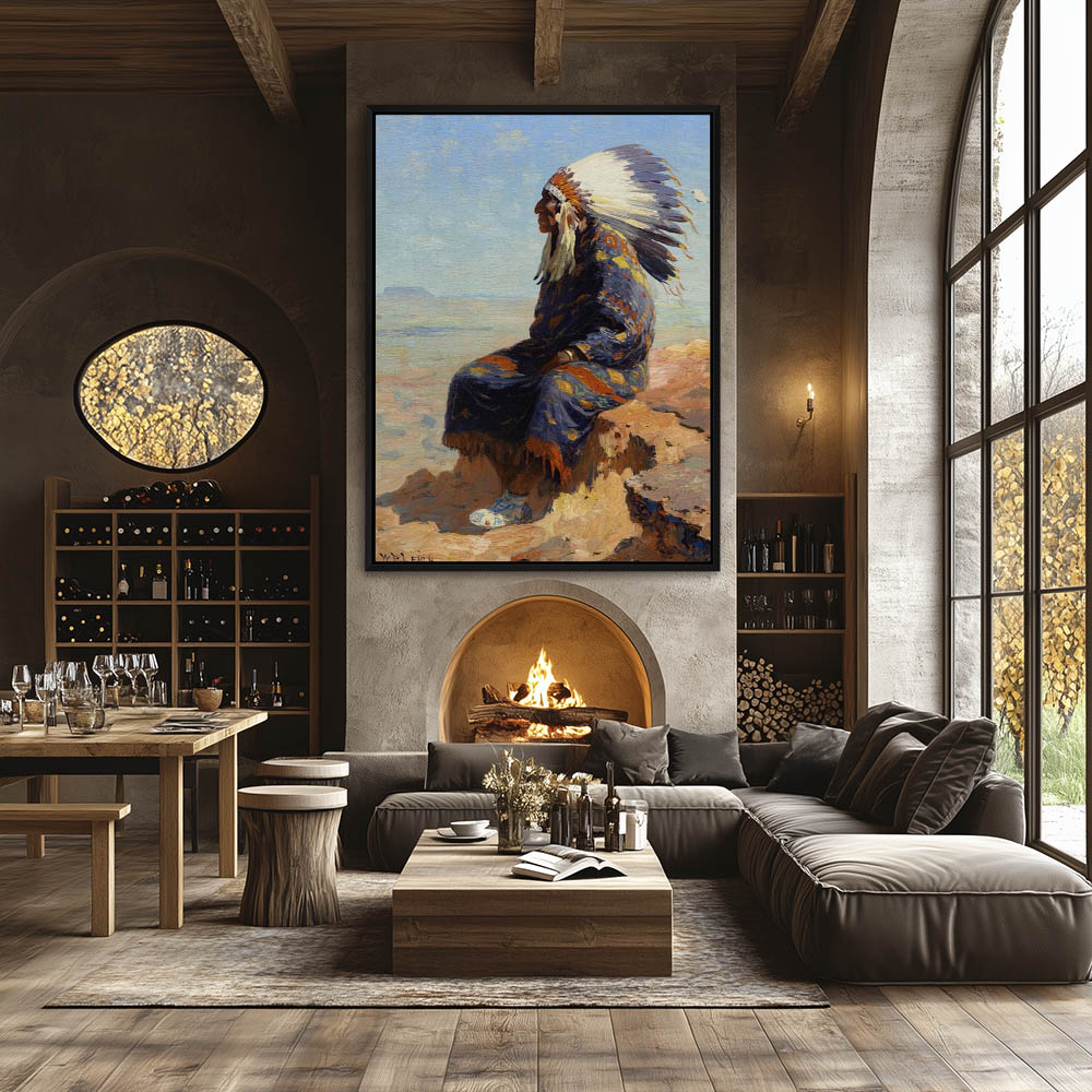 Indian Chief in full feathered headdress, draped in an elaborately patterned blanket and beaded moccasins