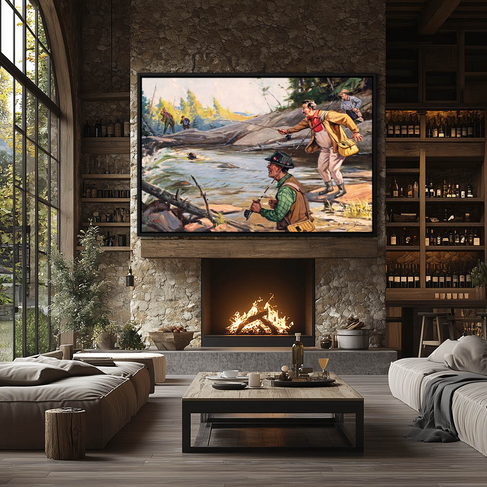 Landscape Painting with Fishermen Retreving a Hat from the Water