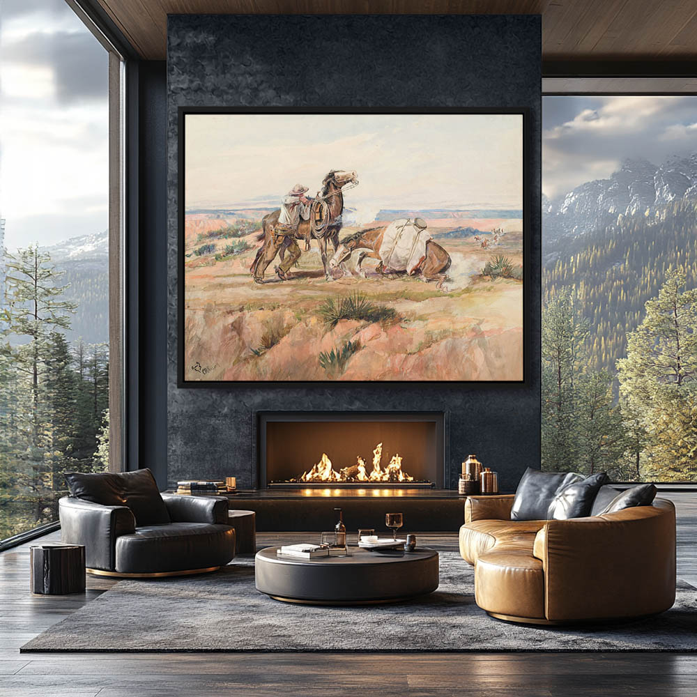 Cowboy firing on the Indians in the distance that attacked him and his two horses