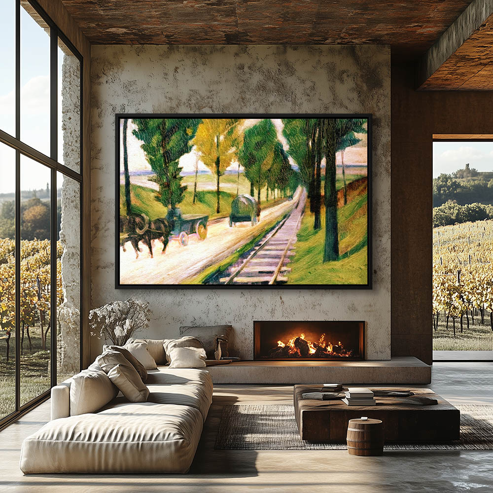 Abstract Landscape Painting With a Tree Lined Road and Horse and Wagons