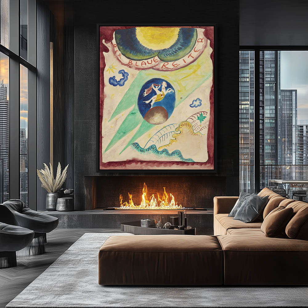 Abstract composition with a rider on horseback and a peacock- like bird in isolated color fields