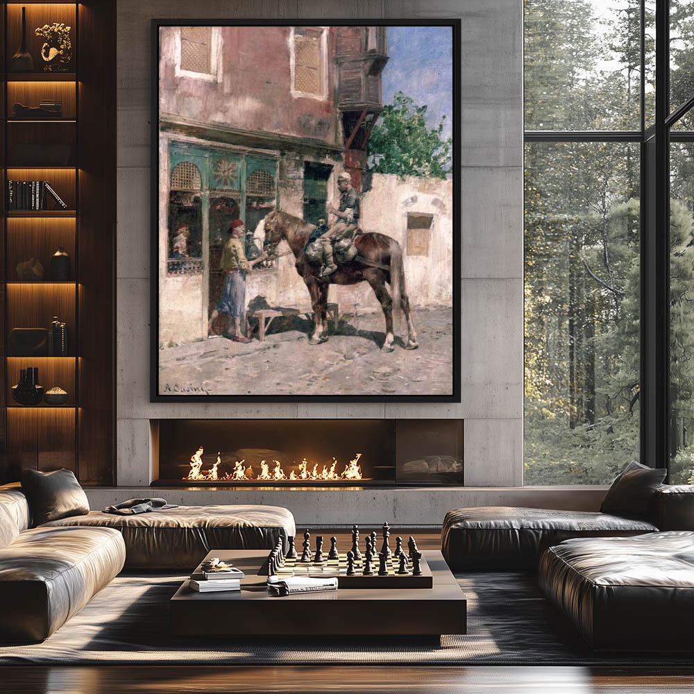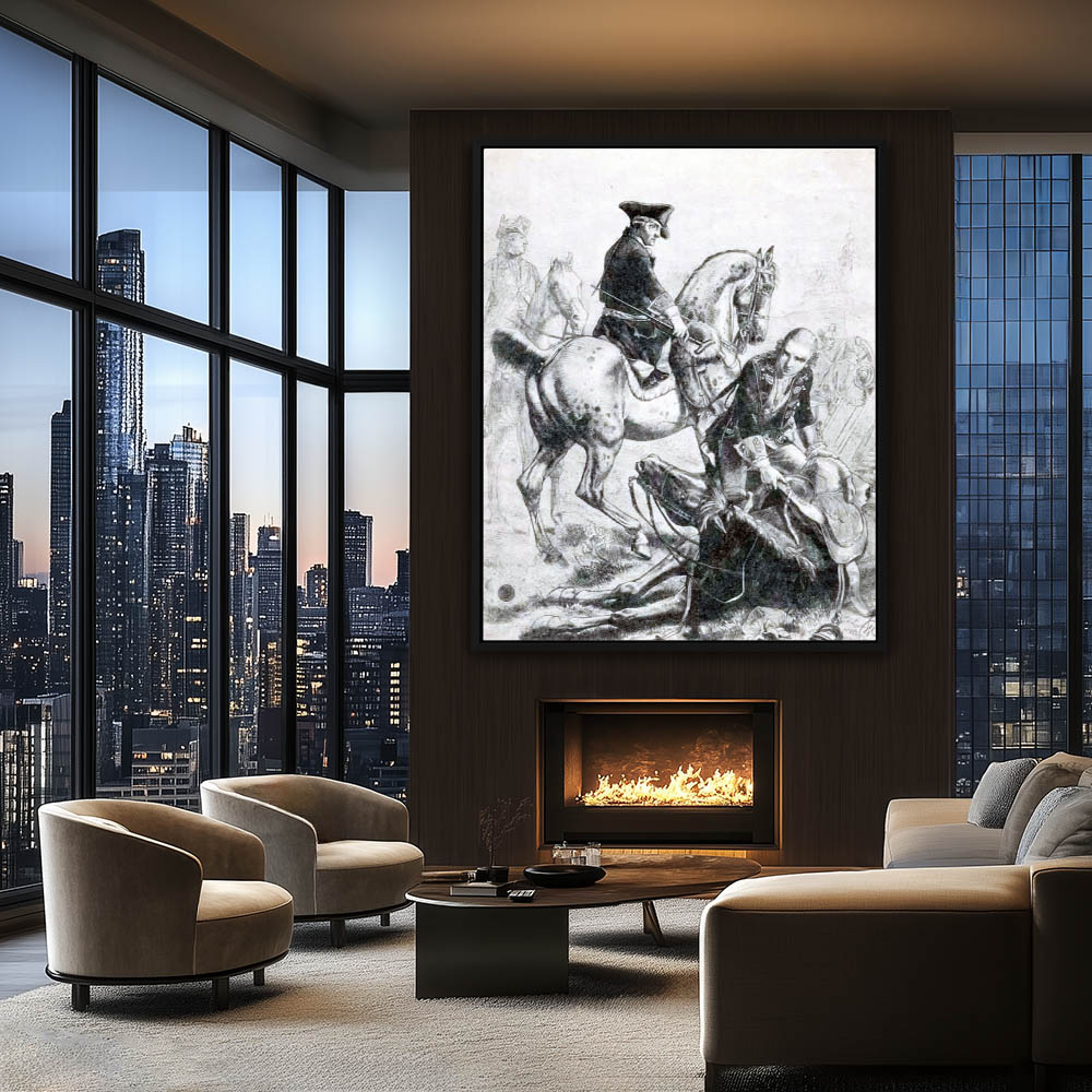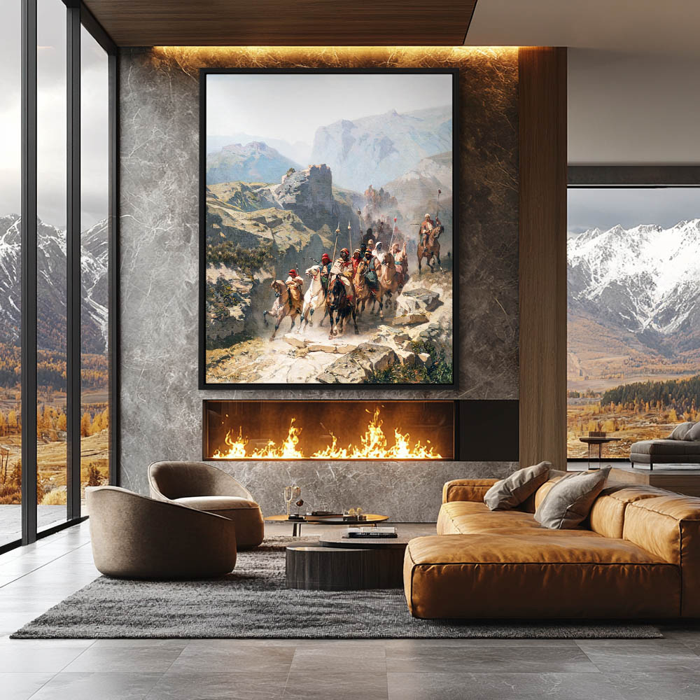 Indian lookout on horseback in a snowy winter landscape inspecting figures on the horizon