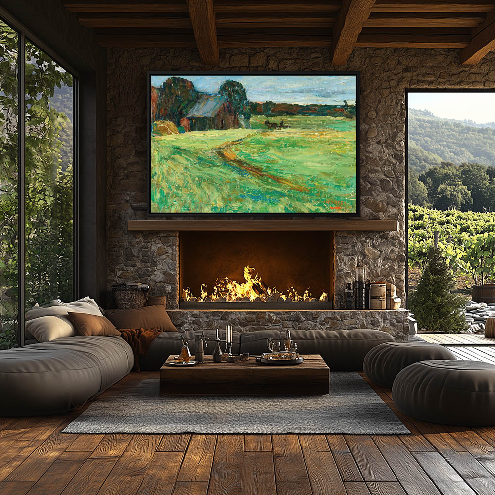 Pastorial landscape with path to a barn with a pony