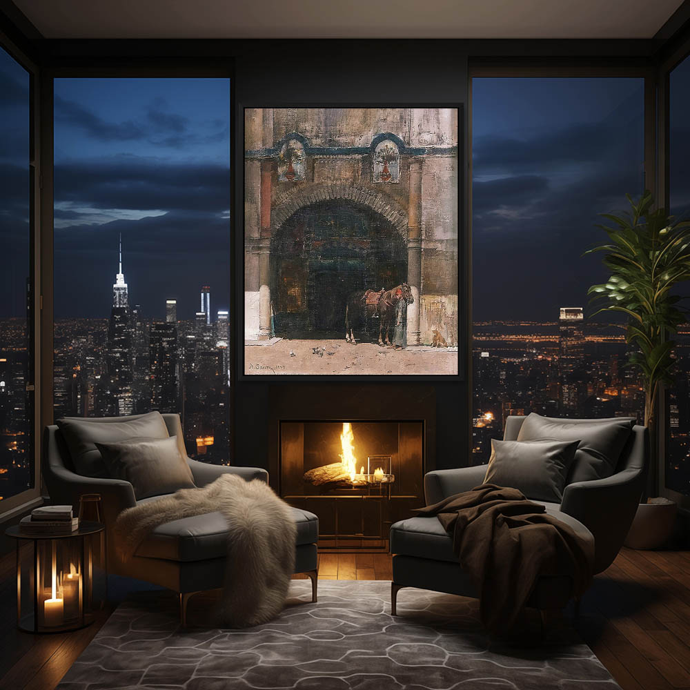Animal Painting with a Horse and Figure in Front of a Building