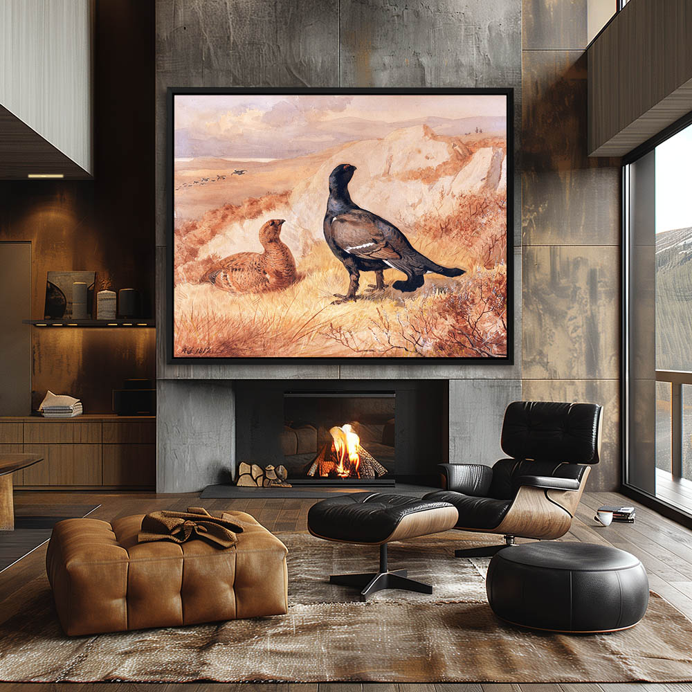 Open Landscape Painting with Gamebirds Resting and Hunters Approaching
