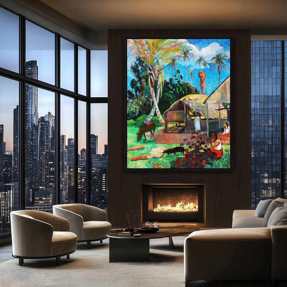 Vintage Landscape Painting with a Hut on the Palm Tree lined Shore in Jamaca