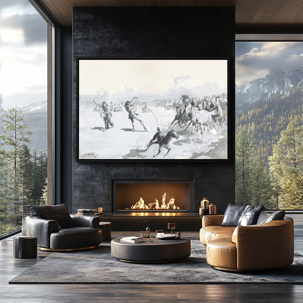 Indians circling Cowboys huddled back to back behind horses laid down for cover