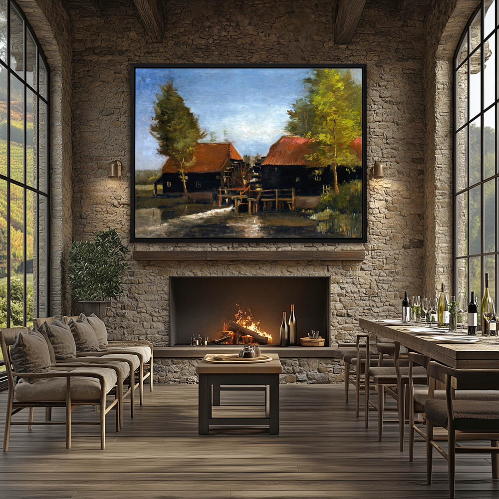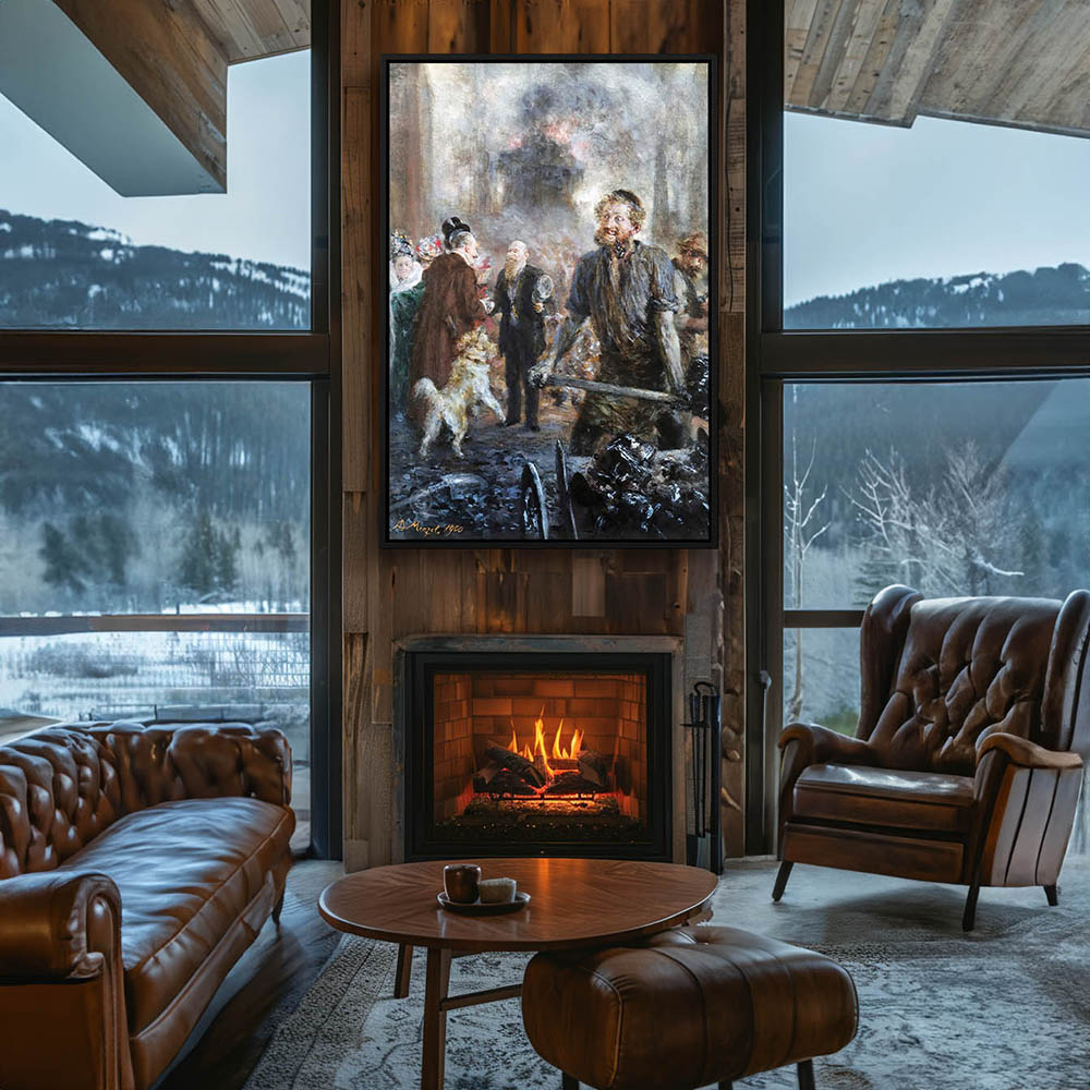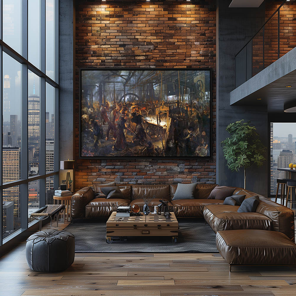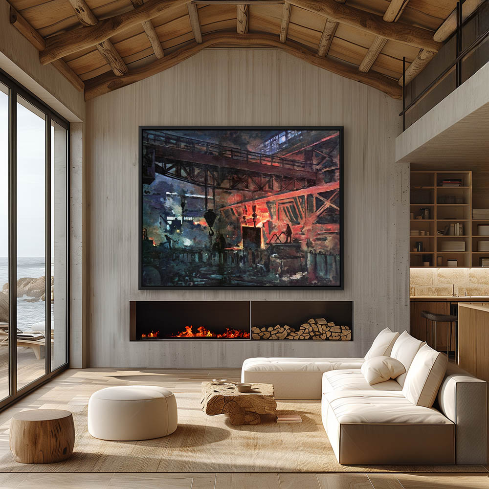 Vintage Industrial Painting with Workers in The Old Iron Rolling Mill