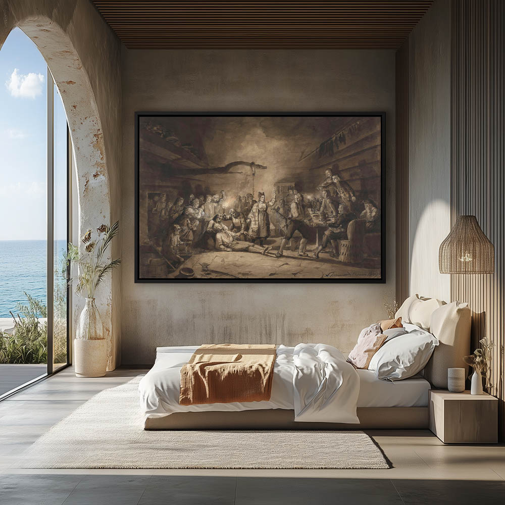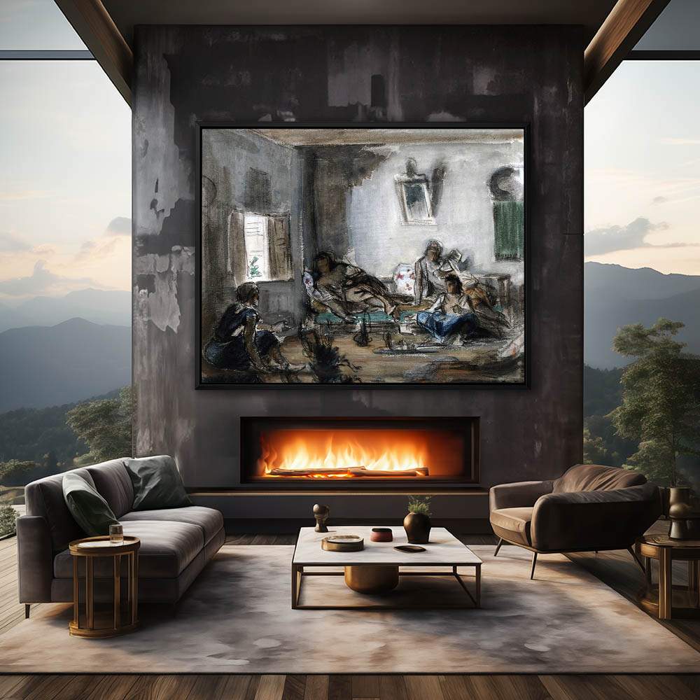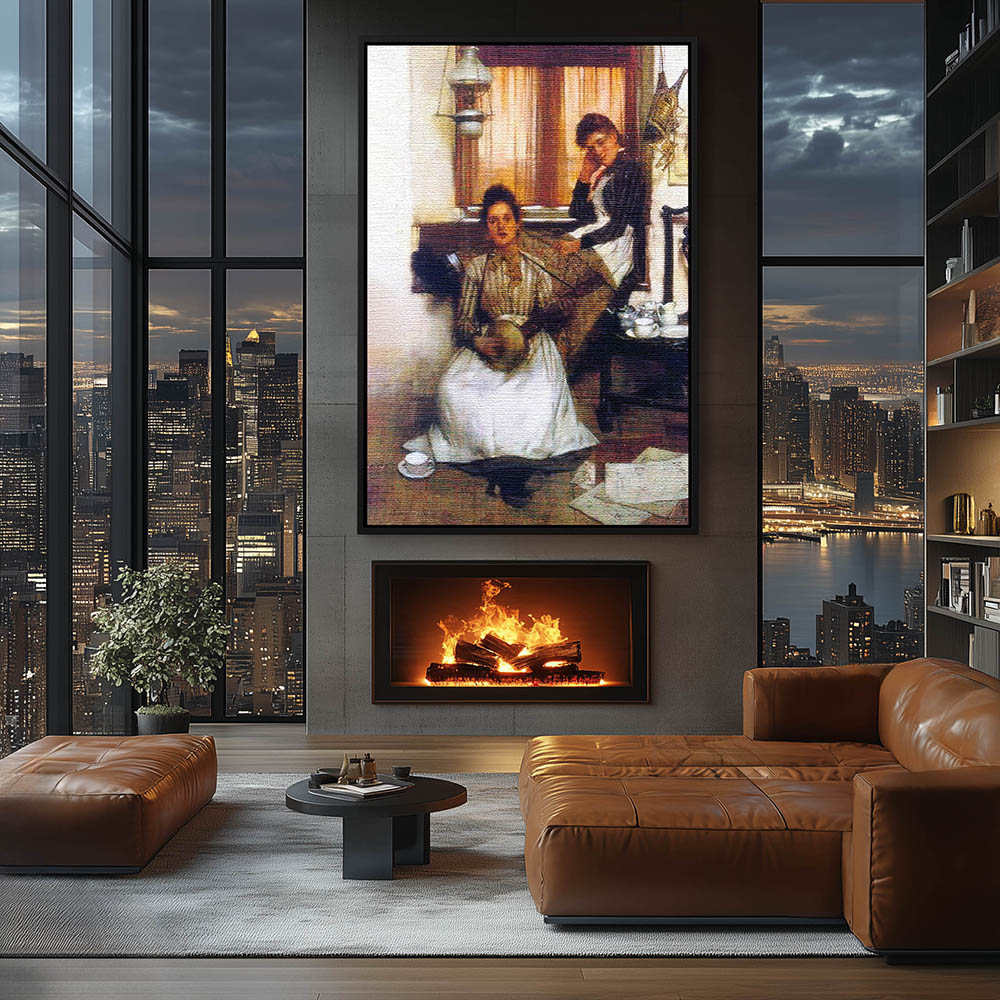 Interior Painting with Two Females Playing a Tune on a Banjo