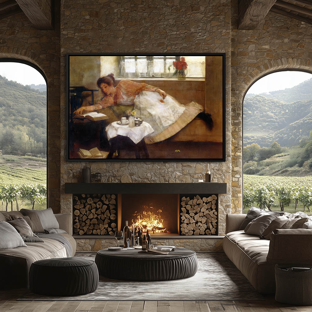 Interior Painting with a Female Laying on a Couch Reading a Book and Having Tea