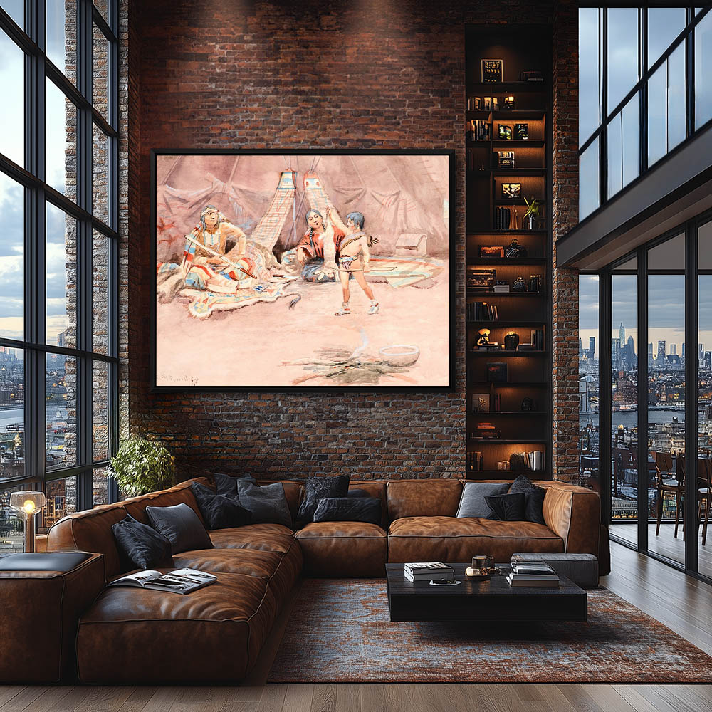 Interior of a teepee with an Indian family admiring the rabbit killed by a small boy