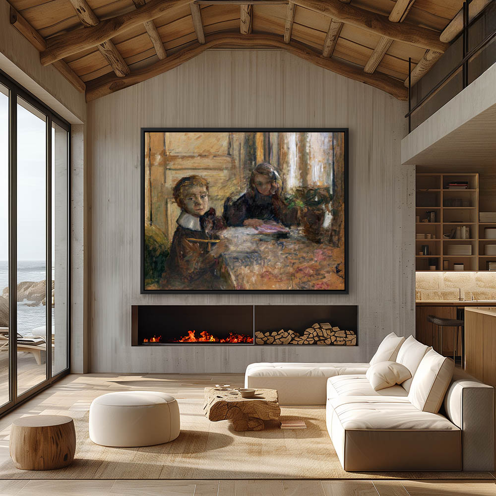 Two children sit at a table doing school work with papers and a plant on the table and a window to the right.