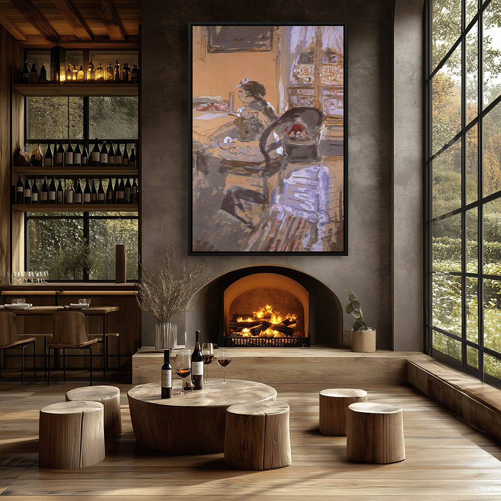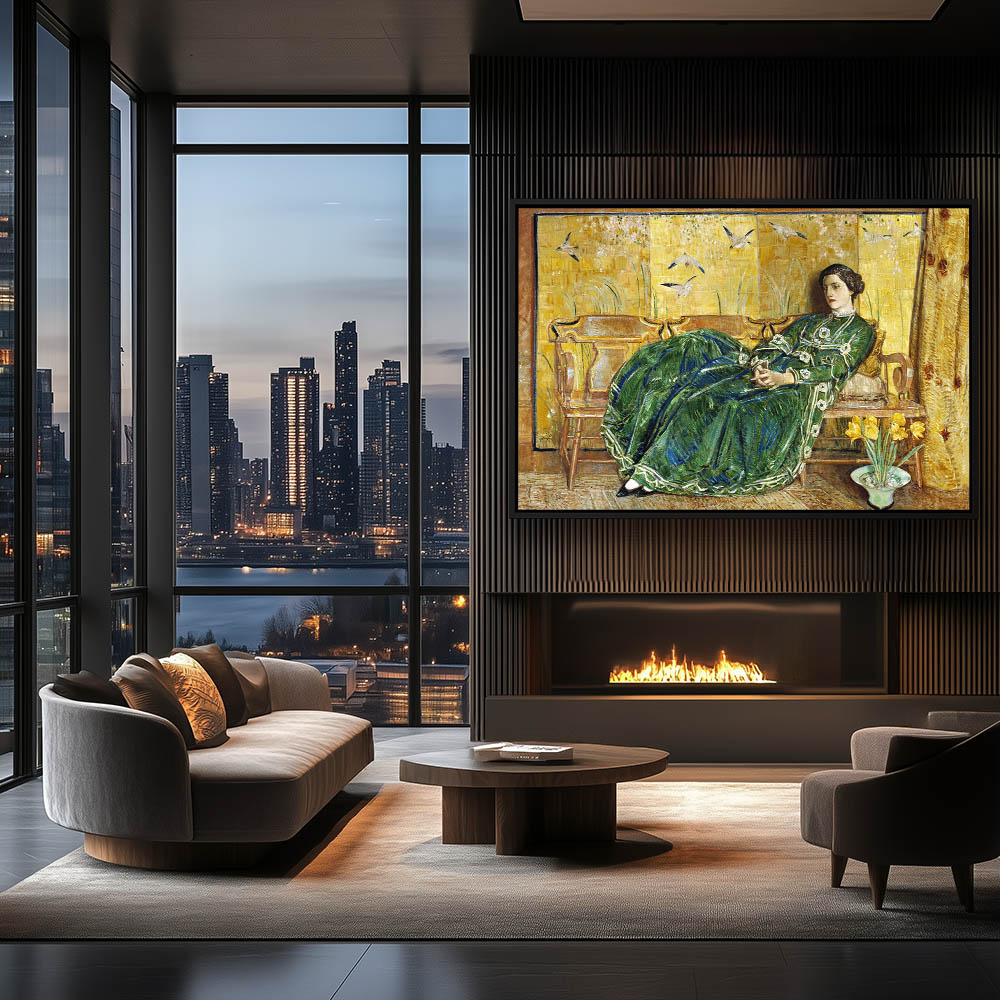 Woman lounging on a bench in front of a panel decorated with birds and a potted flower in front of her