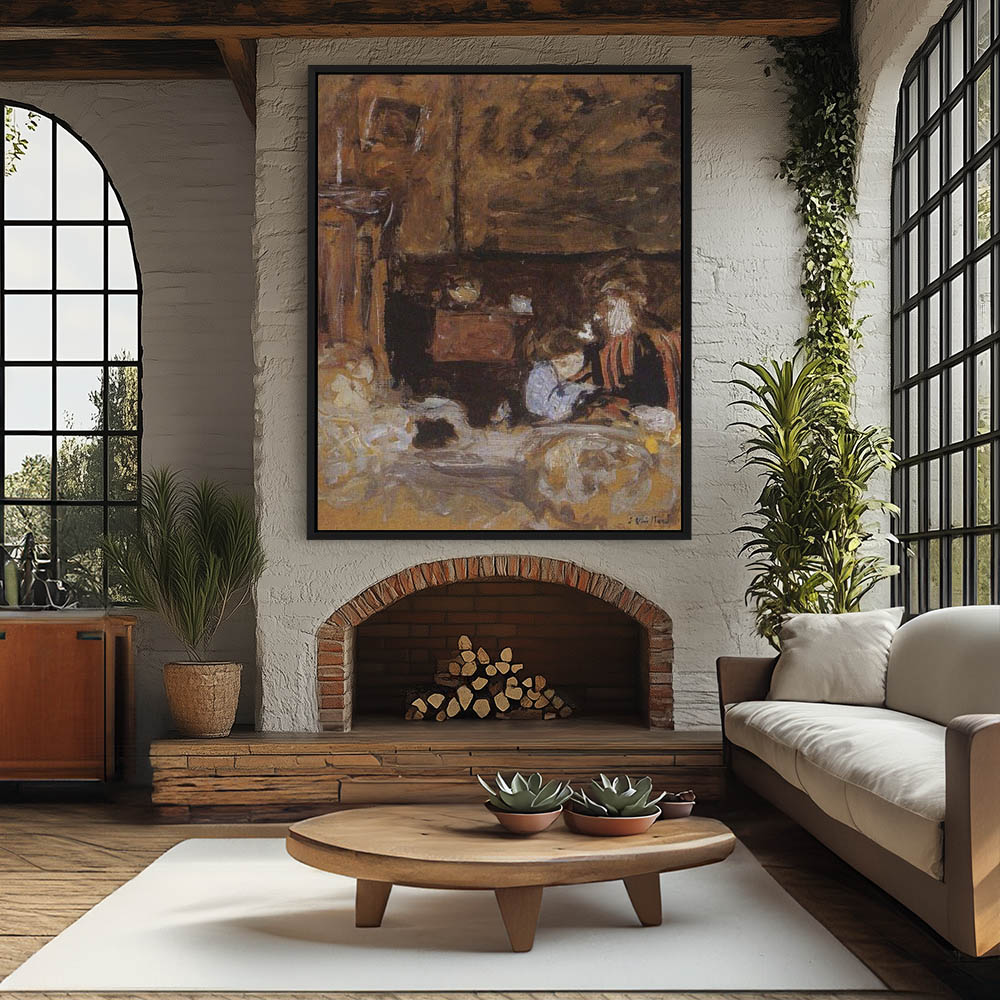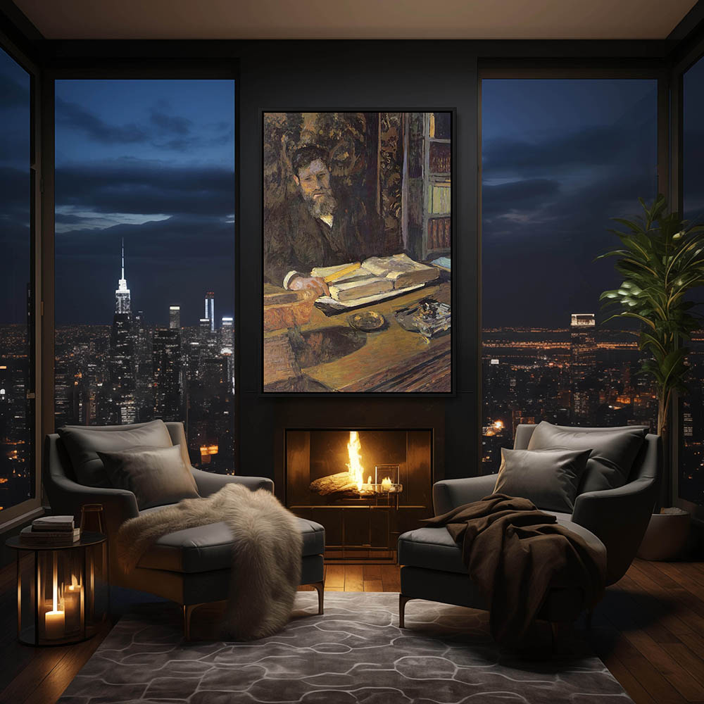 Bearded man at his desk with an open book and low light from an unseen lamp to the left.