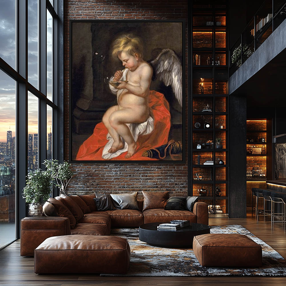 Vintage Figurative Painting of Cupid Blowing Bubbles