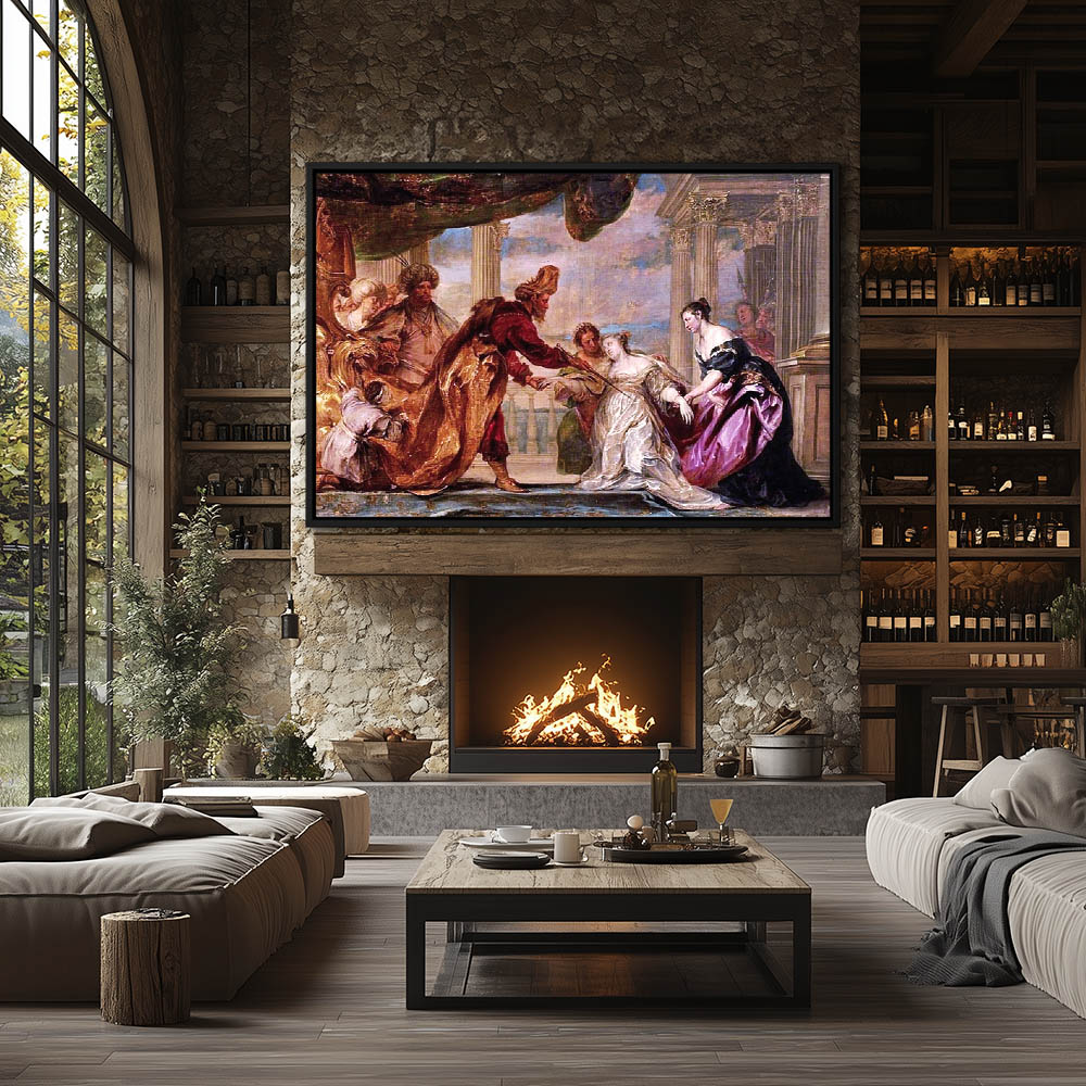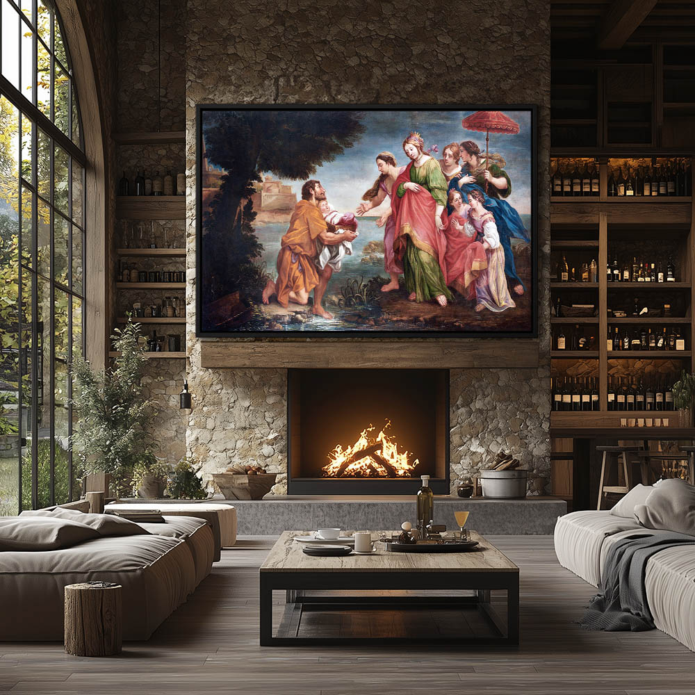 Vintage Figurative Religious Painting of Mosesw being Pulled out of the River