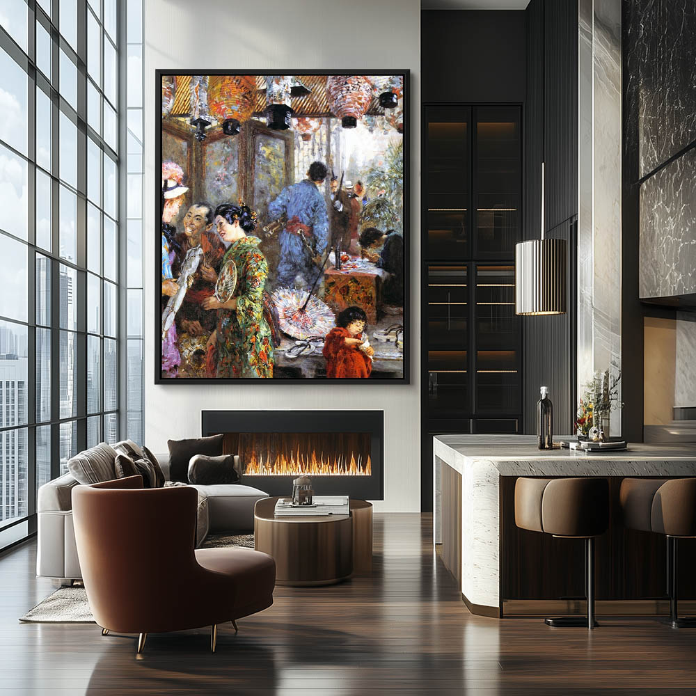 Vintage Figurative Painting with Japanese at an Painting Exhibition