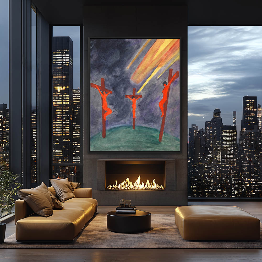 Vintage Figurative Portrait Painting of Jesus Christ on The Cross and the Good Theif